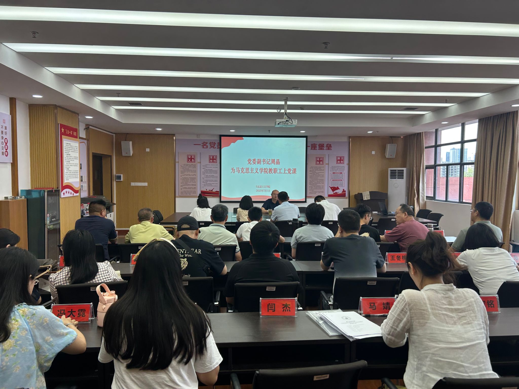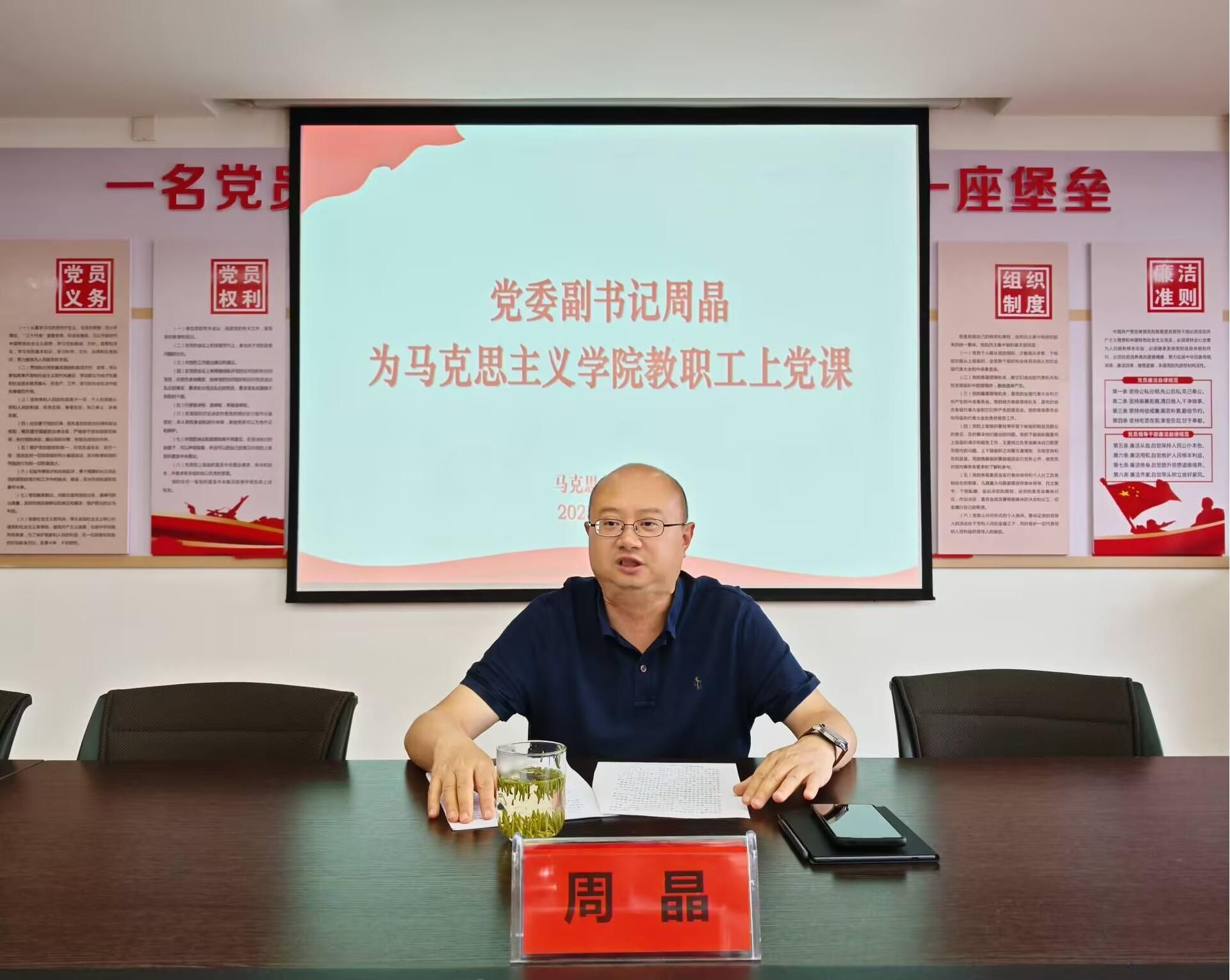 7月1日,在中国共产党成立104周年之际,党委副书记周晶深入马克思主义学院开展调研,并以《深入学习贯彻中央八项规定,加强作风建设,推动马克思主义学院工作再上新台阶》为题,为全体党员干部讲党课。