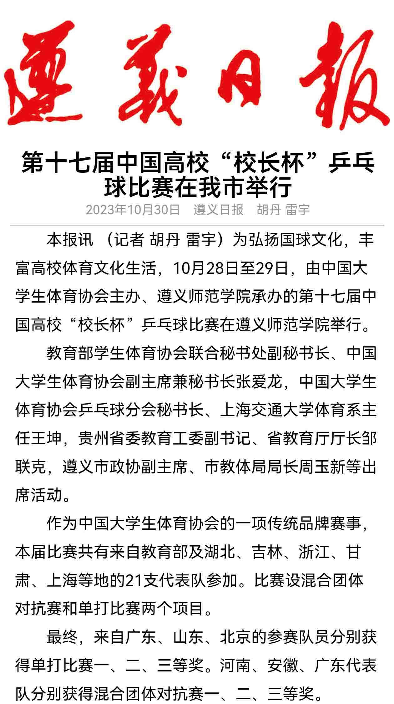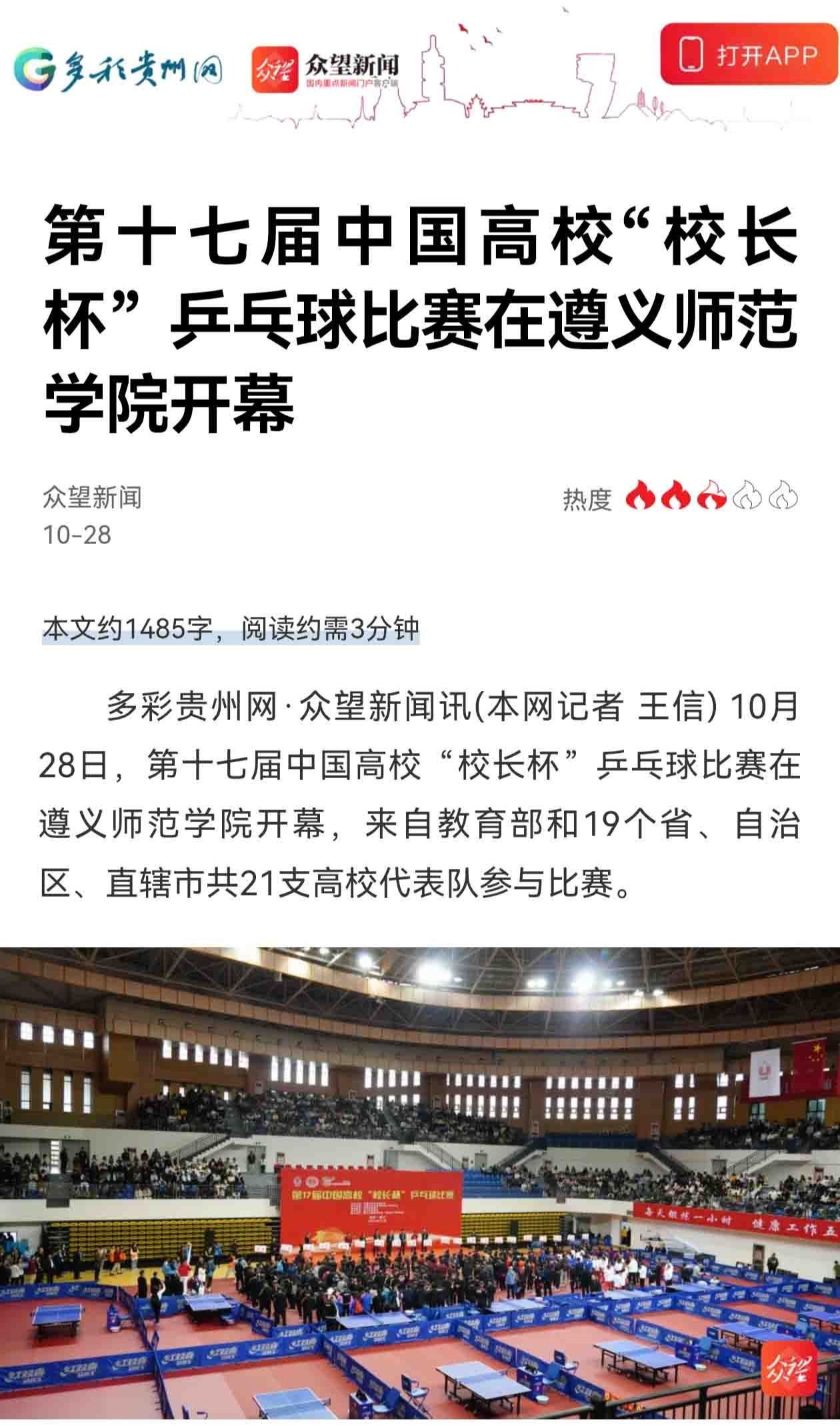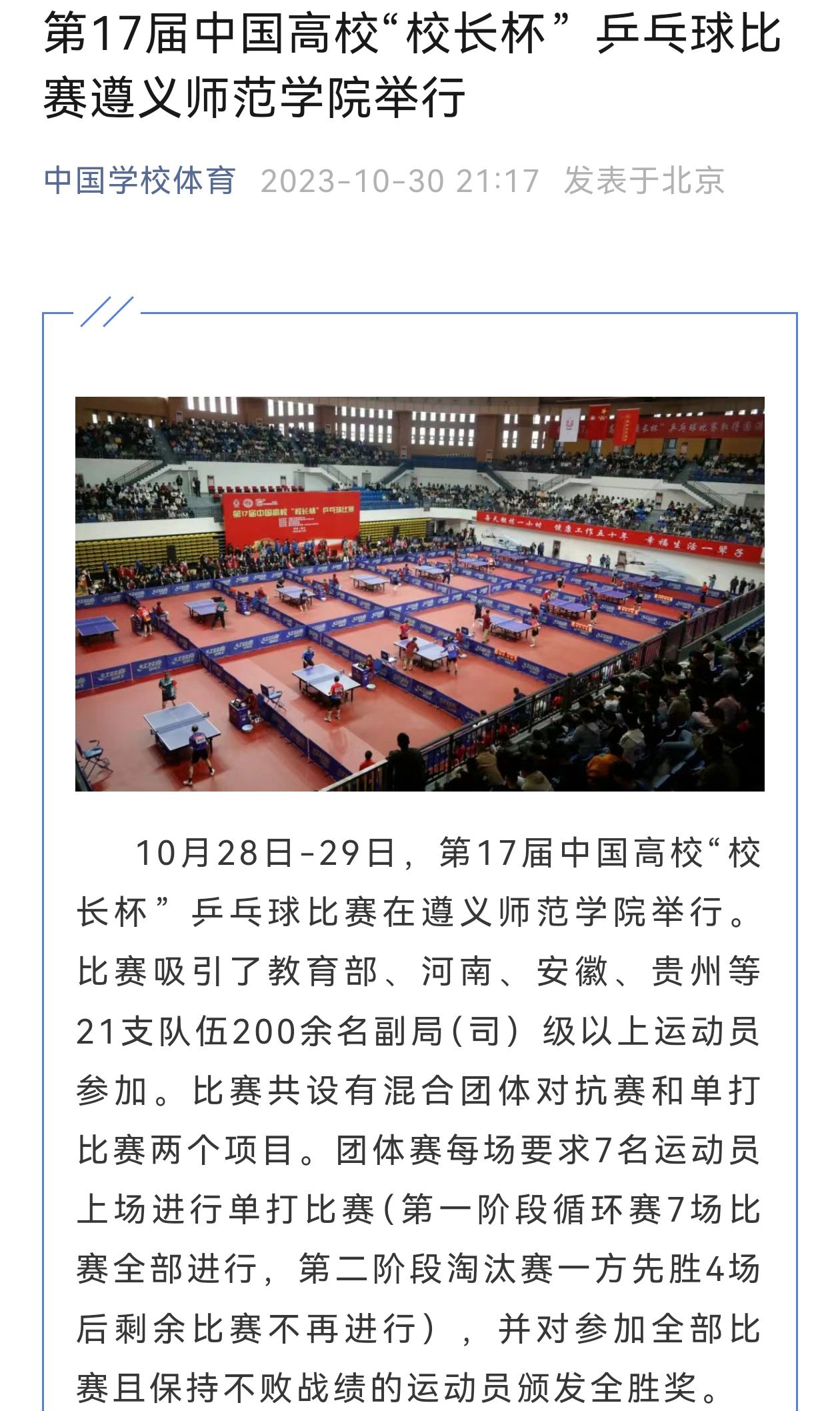 第十七届中国高校“校长杯”乒乓球比赛于10月28日至29日在微信买球官方网站举行,引各级媒体关注。