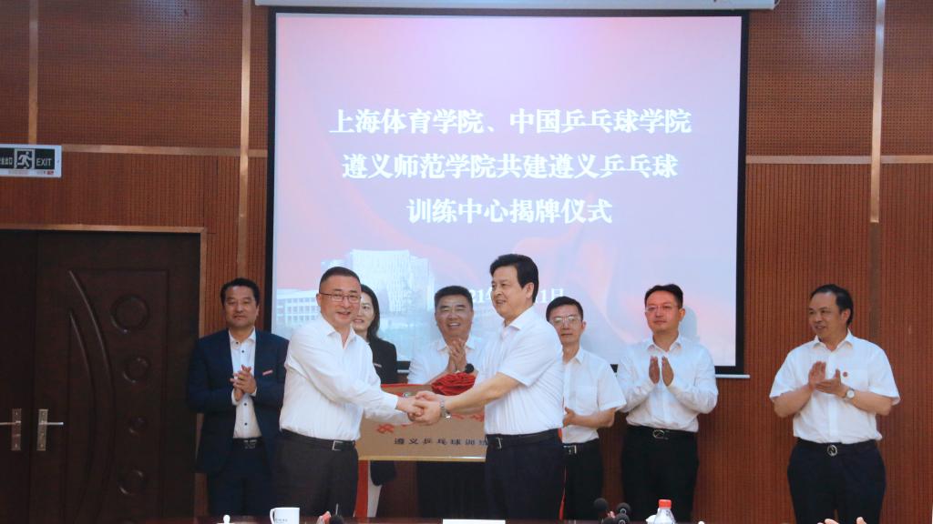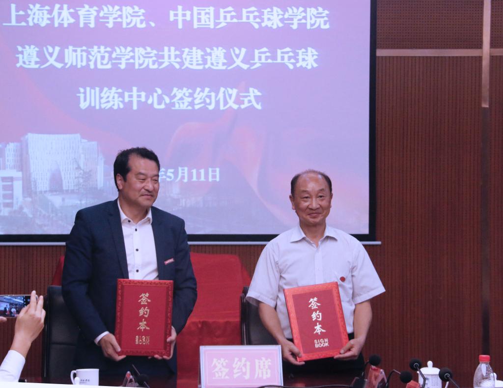 曾伯平与陈彬签订《中国乒乓球学院微信买球官方网站共建遵义乒乓球训练中心协议》,张鹏与杨玲签订《上海体育学院微信买球官方网站合作协议》后,李崟和张波共同为中国乒乓球学院遵义乒乓球训练中心揭牌。
