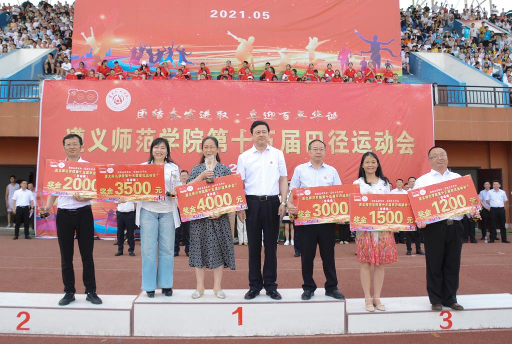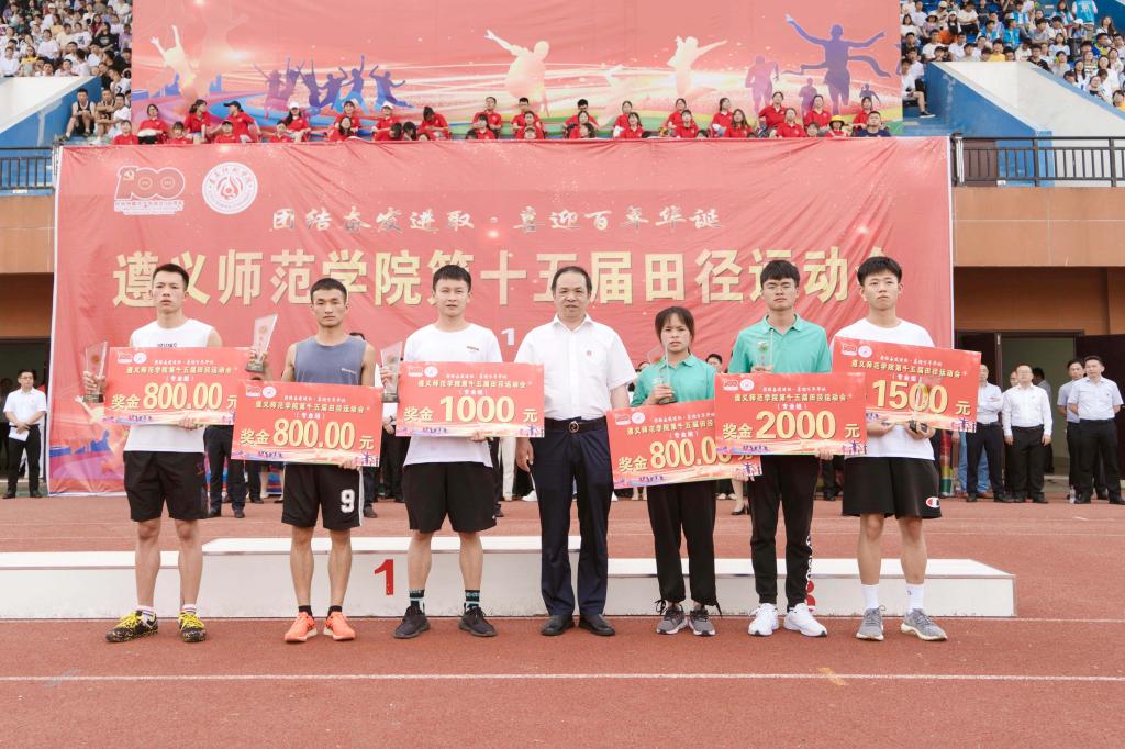 刘肇军宣布获体育道德风尚奖和破学校田径纪录名单,总裁判长赵军宣布专业组和普通组团体总分名次,在场领导为获奖集体和个人颁奖。
