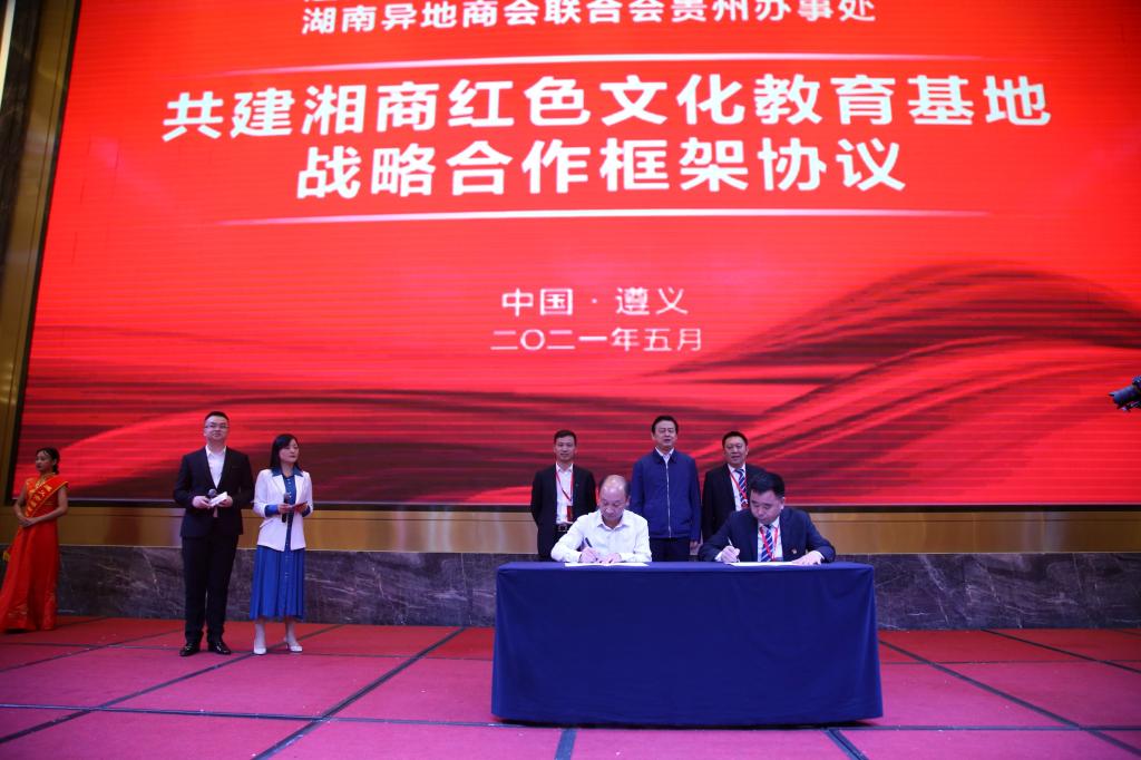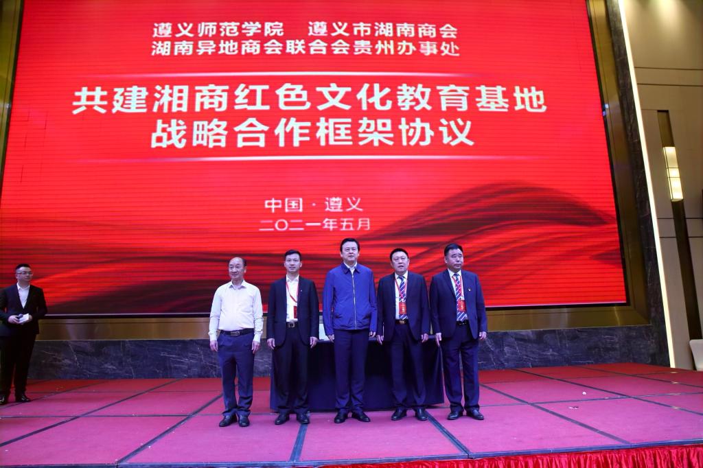5月29日下午,学校与遵义市湖南商会、湖南异地商会联合会贵州办事处在遵义市湖南商会第三届一次会员代表大会•十周年庆典暨湘商走进红色圣地携手助推遵义发展招商引资推介会上,举行了共建湘商红色文化教育基地战略合作框架协议签约仪式。