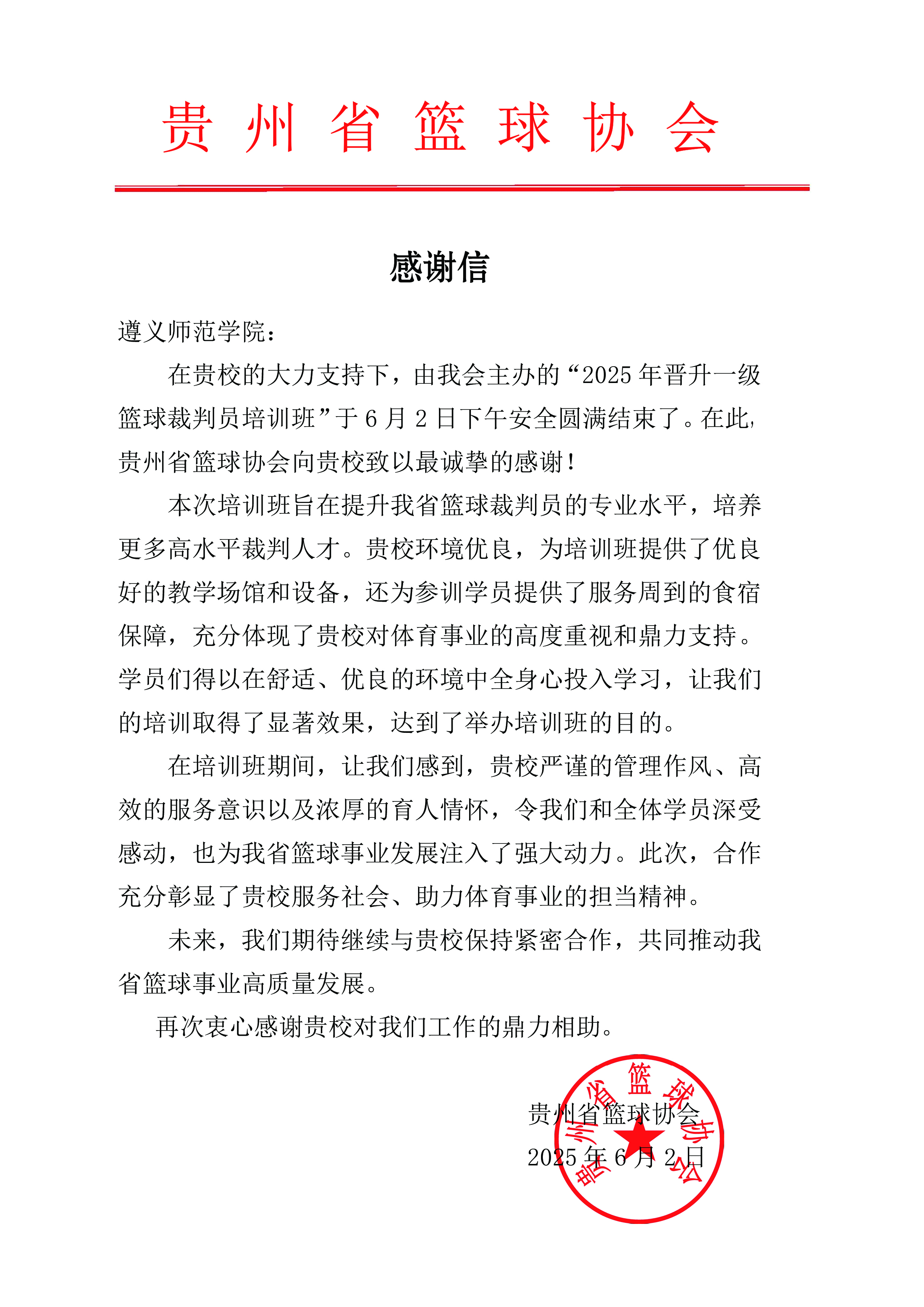 本次培训班得到了贵州省篮球协会高度认可,协会对管理作风、精心服务等方面给予了充分肯定,并就下一步合作作了进一步沟通。学校将加大与贵州省篮球协会合作,共同推动我省篮球事业高质量发展。