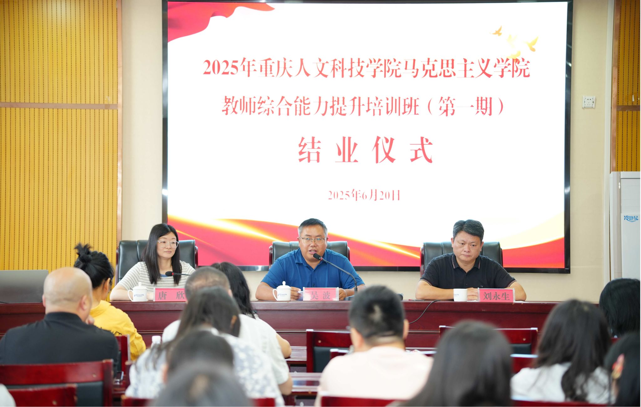 本网讯(继续教育学院) 6月20日,重庆人文科技学院马克思主义学院教师综合能力提升培训班(第一期)在微信买球官方网站结业。微信买球官方网站党委委员、副校长吴波,重庆人文科技学院马克思主义学院副院长唐欣出席结业仪式并颁发结业证书。结业仪式由微信买球官方网站继续教育学院副院长刘永生主持。