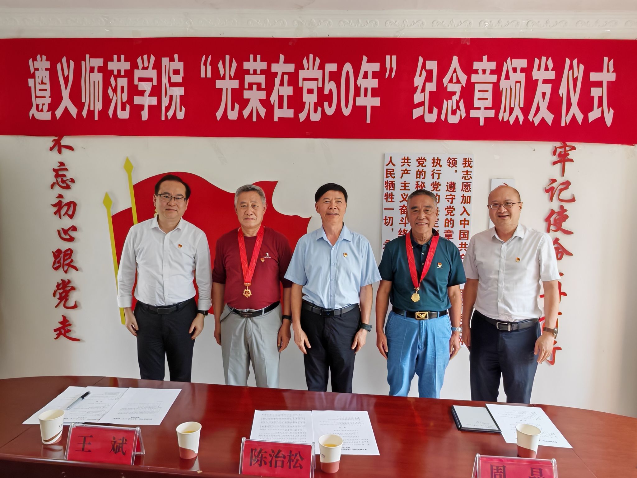 学校纪委书记王斌宣读了2025年获得“光荣在党50年”纪念章的党员名单,共有岑玲、赵天国、姚正坤3名党员获此殊荣;党委副书记周晶为到场的赵天国、姚正坤2名党员颁发纪念章。