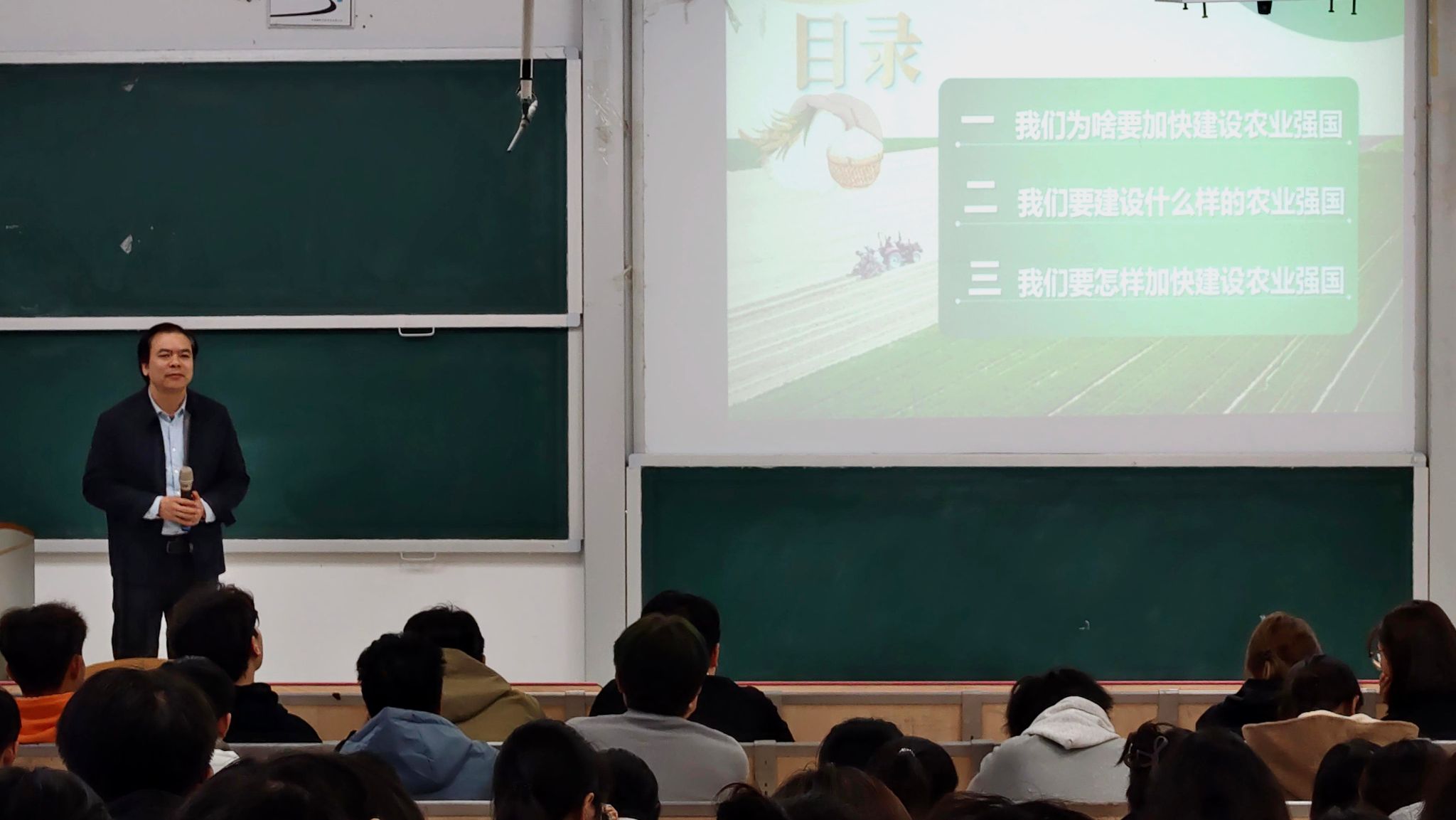 本网讯(文/余康 图/李诗语) 11月13日下午,微信买球官方网站党委常委、副校长肖仲久在执治楼105教室讲授《阔步迈向农业强国》思政课。