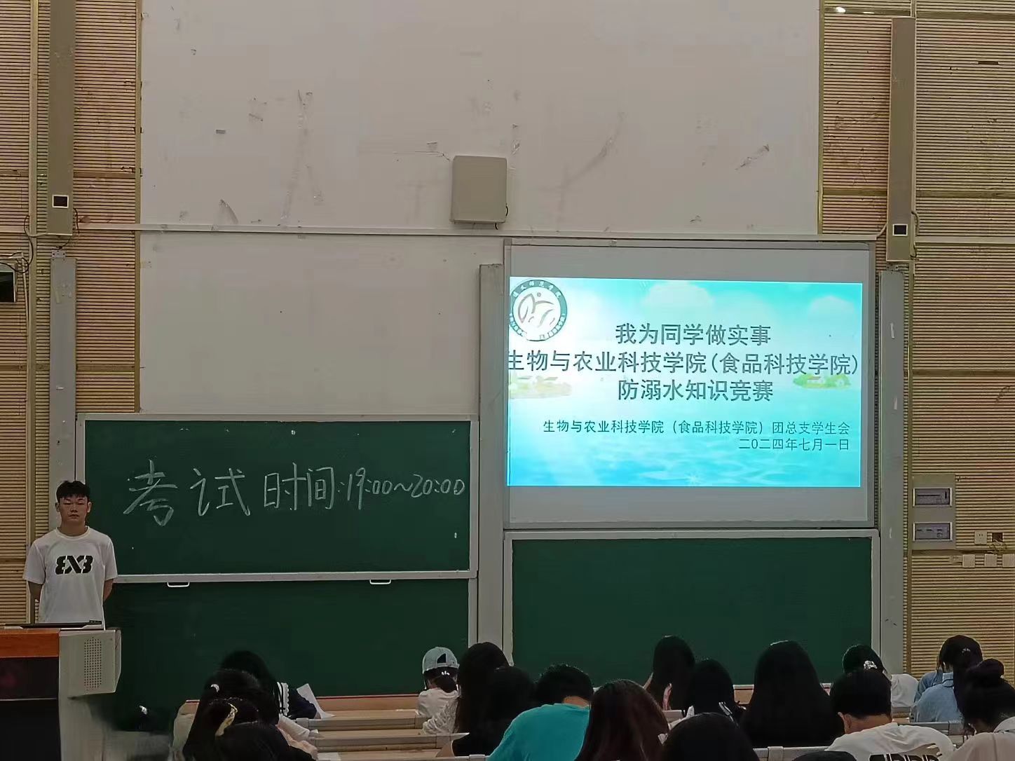 为进一步增强校园安全教育,帮助同学们掌握正确的防溺水知识技能,我院于2024年7月1日19:00在执理楼-103教室开展防溺水知识竞赛,本次活动由学生会体育部负责。