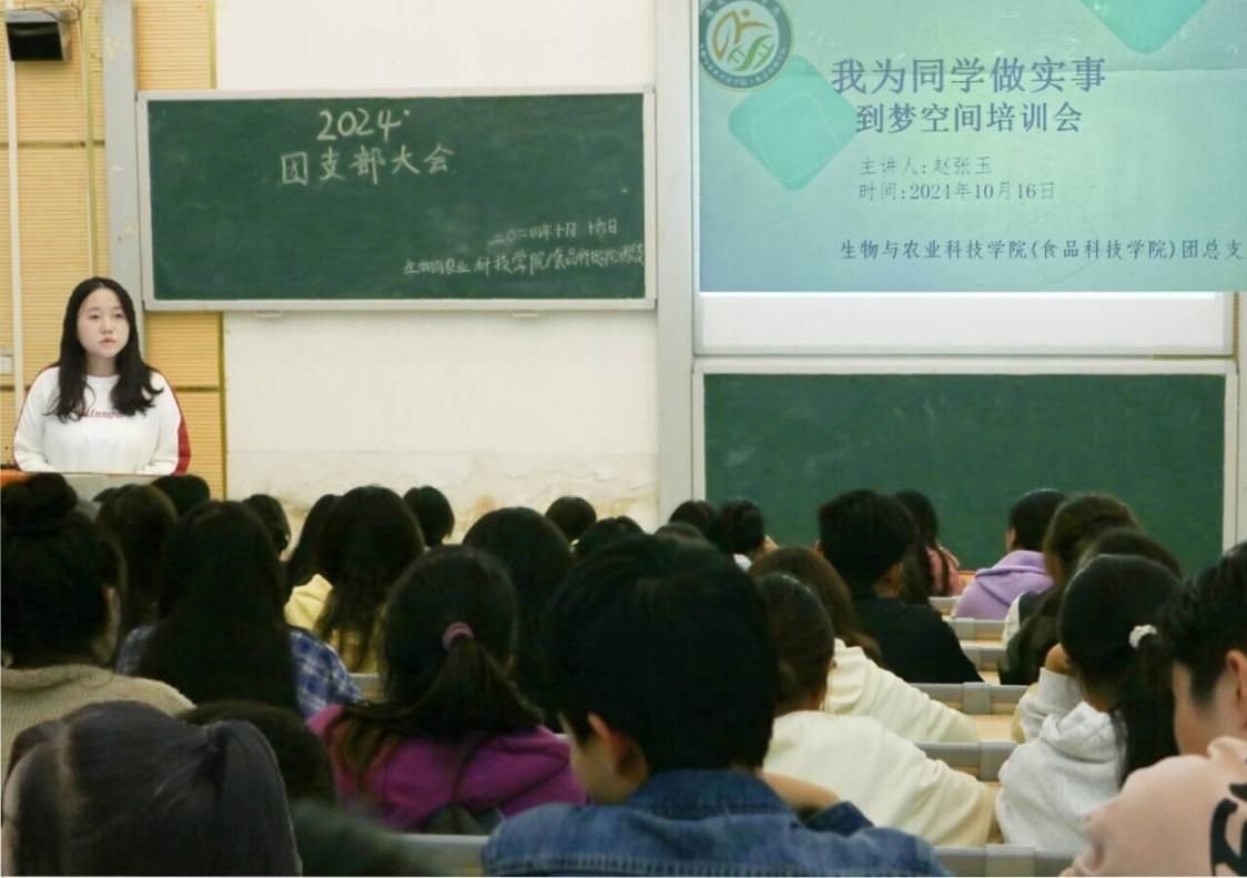 生物与农业科技学院(食品科技学院)团总支学生会于2024年10月16日在执理楼-103教室举行第二课堂培训会,本次会议由组织部负责人吴玉洁主持,赵张玉主讲。2022级、2023级、2024级各班负责人参与。