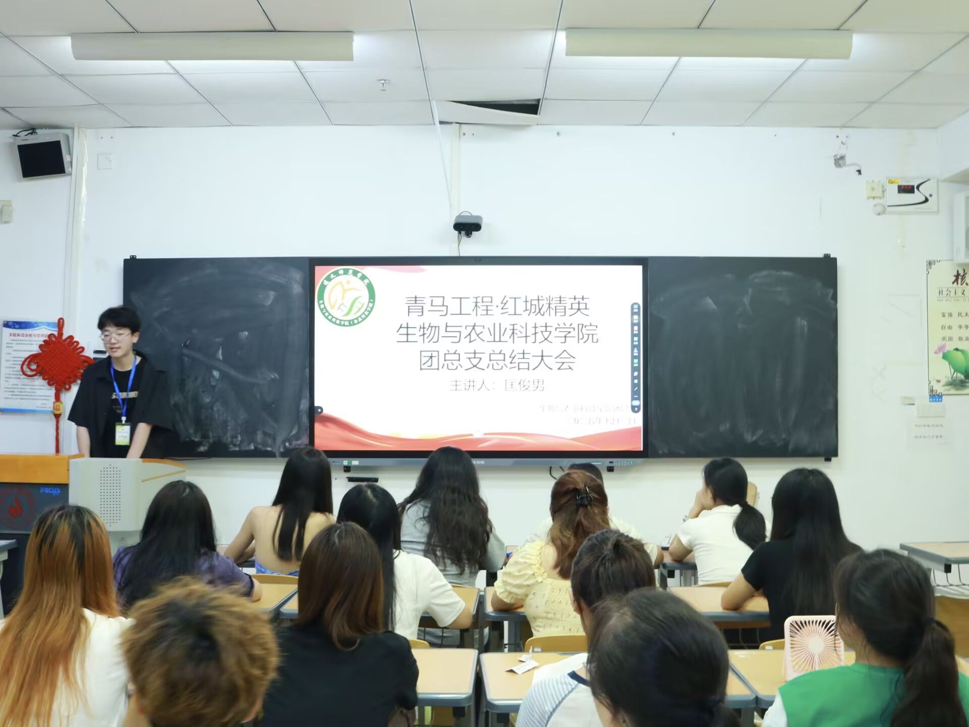 大会伊始,匡俊男重点解读第二课堂的积分细则,针对签到考勤标准化流程与请假审批电子化规范进行专项强调。紧接着,组织部干事高海涛详细讲解团课规范开展流程,团支部工作记录的合格撰写标准,强调班团干部需搭建“学校-学院-班级”三级沟通桥梁,确保团学任务落地。随后,团总支副书记吴玉洁对智慧团建上高频出现的问题进行剖析,并提出相应的解决方案。最后,吴玉洁对本次学期团学工作成果进行系统总结,肯定各团支部在活动组织、思想建设等方面的成效,并部署新学期任务。