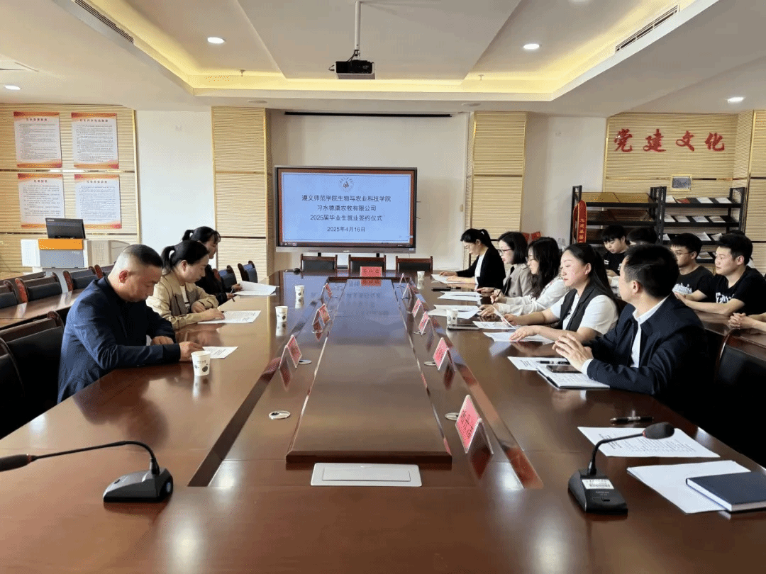 4月16日下午,微信买球官方网站与习水德康农牧有限公司在执理楼213会议室举行生物与农业科技学院2025届毕业生就业签约仪式。学校招生与毕业生就业指导处处长李静、生物与农业科技学院副院长(主持行政工作)隋常玲、党总支副书记方园、副院长尹明智、谢丹洁老师、陈翠萍老师,习水德康农牧有限公司遵义区域综合部经理张琼、遵义区域人事经理代成池、技术部经理刘循林以及2025届部分毕业生参加了签约仪式。仪式由方园主持。