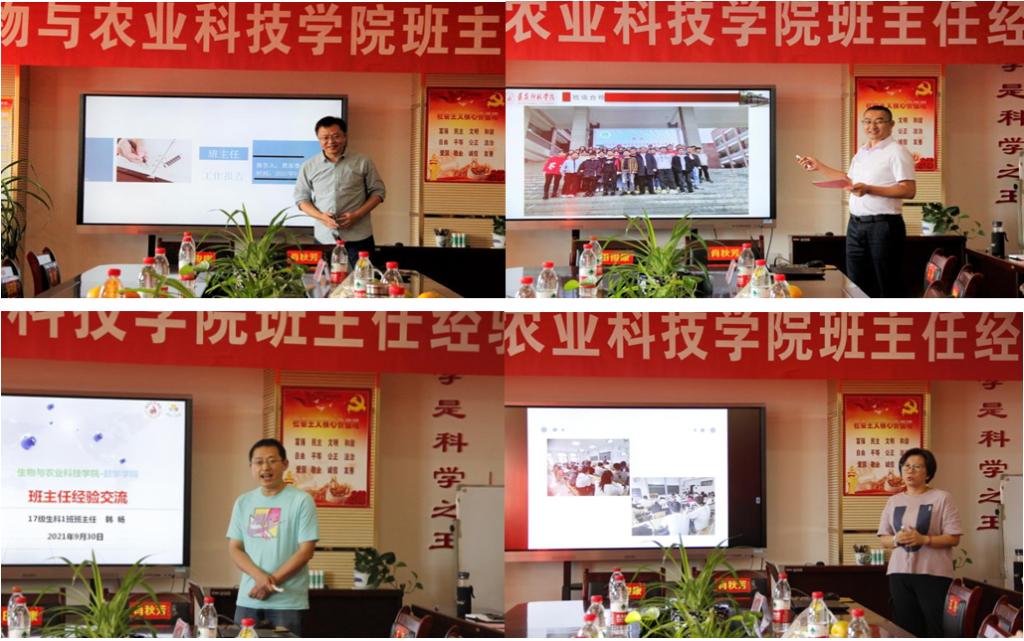 随后,生物与农业科技学院班主任黄家春、韩畅,数学学院班主任张转周、王瑛四位老师从学生工作的不同方面作了交流发言,内容涉及班级管理、学风建设、班级荣誉、竞赛获奖、发展党员、考研率就业率等方面,充分反映出班主任在学生成长成才上的核心领导作用,也展现了各位老师尽心尽力为学生成长和发展呕心沥血,他们不忘初心,在教学中以德服人,对每位同学做到有爱心、耐心、责任心、宽容心、细心。