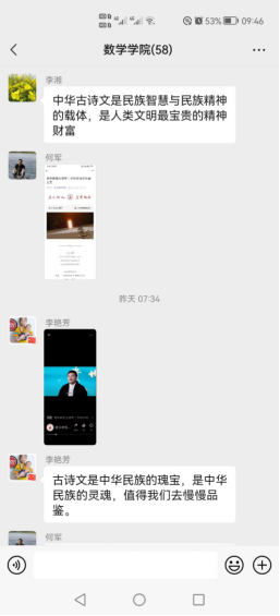 通过观看此次大讲堂,师生纷纷表示,中国古诗词是民族智慧与民族精神的载体,使人类文明最宝贵的精神财富。其中古诗文是中华文化的瑰宝,是中华民族的灵魂。作为数学人,也要加强学习,感受诗词之美。