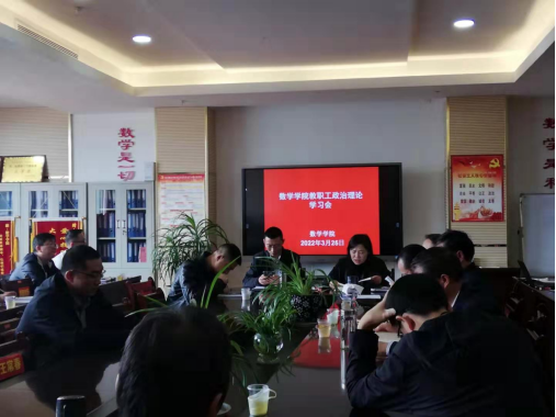 2022年3月25日,数学学院在执理楼313会议室召开政治理论学习会议,肖秋芳书记主持会议,田俊康副院长(主持行政工作)、王丹副书记、何军副院长以及学院全体教职工参加会议。