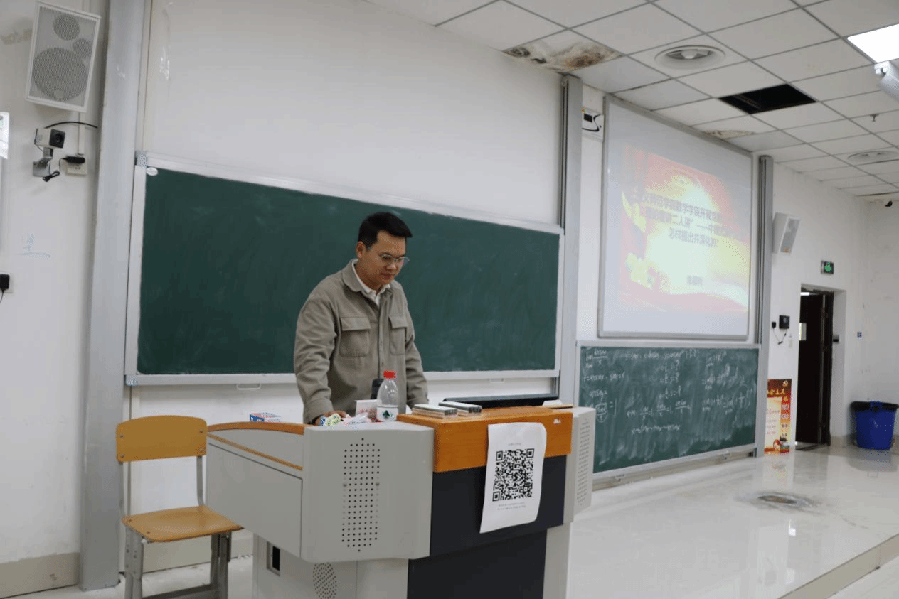 2023年10月10日,数学学院党总支在执闳楼206教室组织开展党的二十大精神“理论宣传二人讲”,宣讲人为数学学院副院长(主持行政工作)田俊康和辅导员陈顺利,宣讲对象为2023级全体学生及其他年级学生代表。