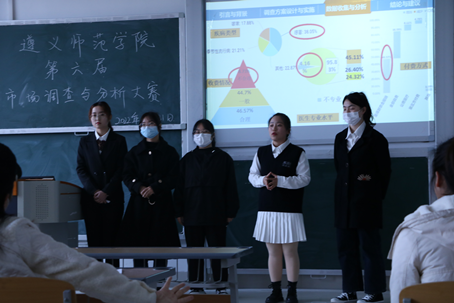 赛事按照全国大学生市场调查大赛组委会统一制定的评分标准和比赛规则,采取市场调查分析报告陈述展示与现场答辩相结合的方式进行,根据报告及答辩的总得分推选出8个团队参加全国贵州赛区实践赛。数学学院庹忠友、郭云喜、刘春杰等8位老师以及管理学院的刘丽诗老师,物电学院的刁宗宝、孙斌老师作为此次比赛的评委,全校19个参赛队经过调查报告评价、调查分析汇报和现场答辩三个部分的精彩较量,由评委进行PPT展示(答辩)现场评分和报告评分,根据“去掉一个最高分和最低分,再求平均分”的计分规则,最终贺永姣组以“遵义市“双减”政策实施现状及影响因素调查分析”(数学学院)获得此次比赛第一名,并推荐排名前八的团队参加全国贵州赛区实践赛。