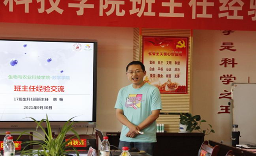 2021年9月30日15点30分,数学学院、生物与农业科技学院在执理楼313会议室召开班主任经验交流会,生物与农业科技学院党总支书记邓崇阳、副院长隋常玲(主持工作)、副院长尹明智、学生科科长任贞常、数学学院党总支副书记肖秋芳(主持党总支工作)、副院长田俊康(主持行政工作)、党总支副书记王丹、学生科副科长欧阳剑东、团总支负责人何青松及两学院全体班主任参与会议,会议由王丹主持。