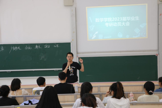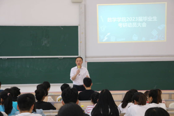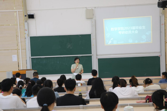 2022年6月23日14:30,数学学院在执文楼119教室召开2023届毕业生考研动员大会。数学学院党总支书记肖秋芳、副院长(主持行政工作)田俊康、党总支副书记王丹、副院长何军、学生科陈顺利、2019级各班班主任及全体学生参加了大会。此次大会由王丹主持。