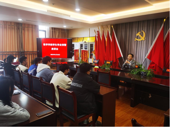 为加强我院学风建设,增强学生学习的积极性和主动性,引导学生自我管理和健康成长,3月30日下午,我院在执理楼313会议室召开2023年春季学生学业预警座谈会。数学学院党总支副书记王丹为2023年春季学期参与课程重修的同学进行了学业预警和心理辅导。