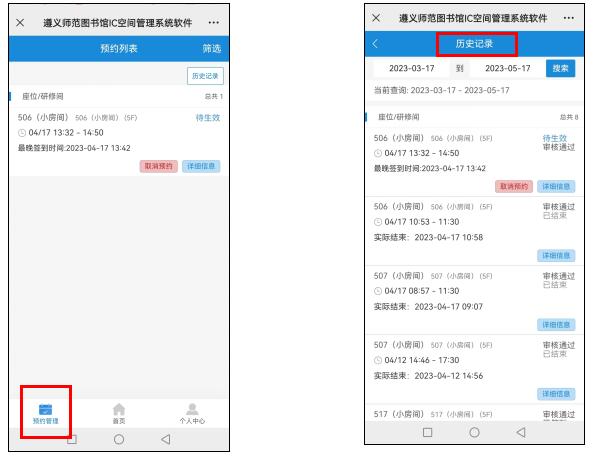 2、移动端:读者通过微信公众号进入“研修间预约”系统,选择“预约管理”(或“个人中心”—“历史记录”)下可在约定起始时间20分钟前登陆预约平台,可取消预约,签到后,也可提前结束使用,释放空间使用权。