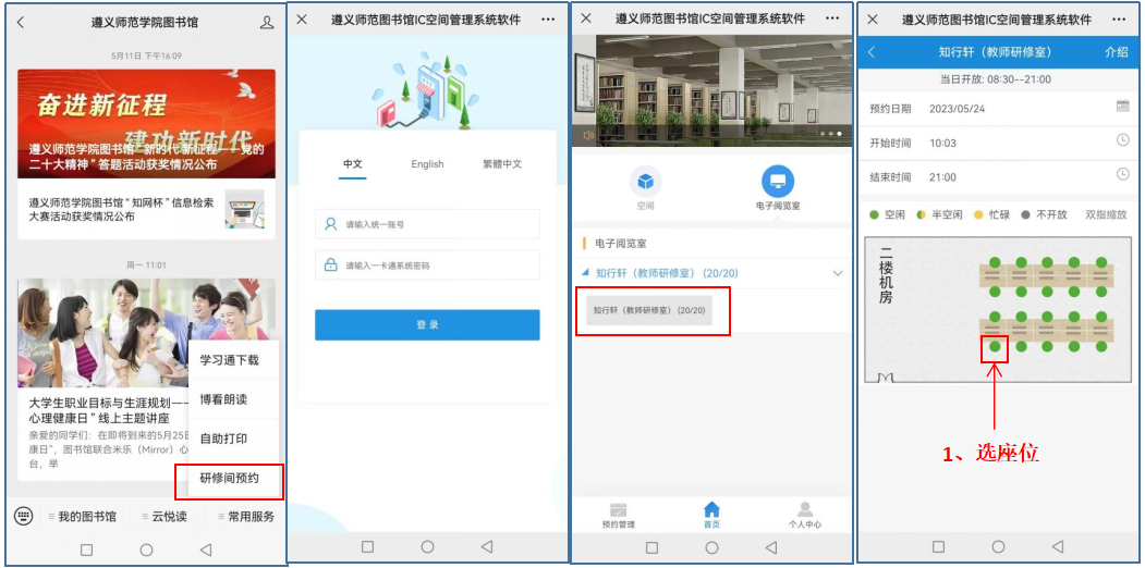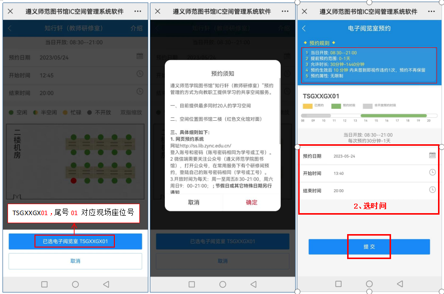 3.登录账户为工号,密码一致。网上预约可预约当天或后1天的座位使用权限。成功预约座位后,需至房间对应的PAD屏下方刷校园卡签到开门,可提前10分钟内签到(或开始后10分钟内签到),半小时后才能签退,否则将记违约1次,并释放空间。