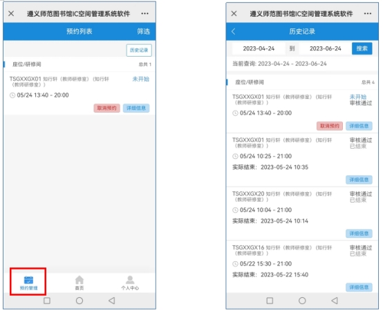 2、移动端:读者通过微信公众号进入“研修间预约”系统,选择“预约管理”(或“个人中心”—“历史记录”)下可在约定起始时间20分钟前登陆预约平台,可取消预约,签到后,也可提前结束使用,释放空间使用权。