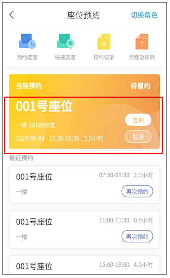 注:签到签退的弹性时间仅仅是为了减少违约,入座时间已预约时间为准。