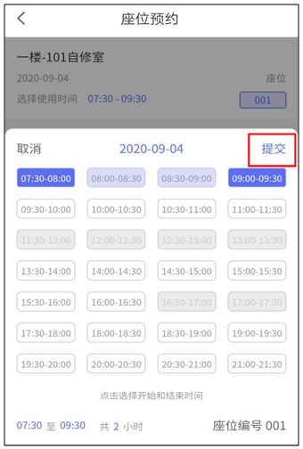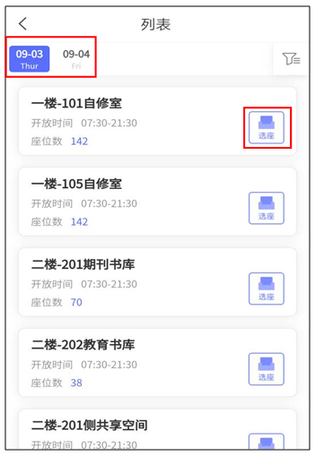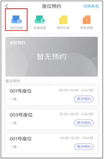 1.预约开始时间为:提前一天的21:00(21点前使用者可预约当天的座位,21点后可预约第二天的座位。)