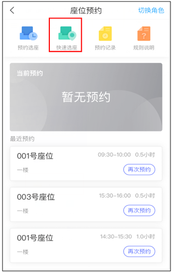 B.快速选座:首页“快速选座”按钮,设置筛选条件,系统会自动分配符合条件的座位给您,适用于“随遇而安”型的预约。