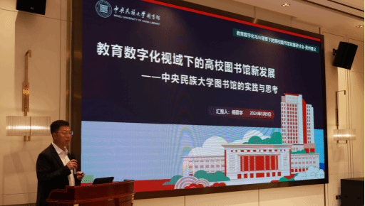 中央民族大学图书馆副馆长杨蔚宇作了题为《教育数字化视域下的高校图书馆新发展——中央民族大学图书馆的实践与思考》的主旨报告,他从教育数字化和AI、以中国式现代化推动图书馆新发展、中央民族大学图书馆的实践探索等方面进行了分享,重点介绍了AI在图书馆信息化建设、信息素养教育、阅读推广、读者服务等方面的应用与实践。
