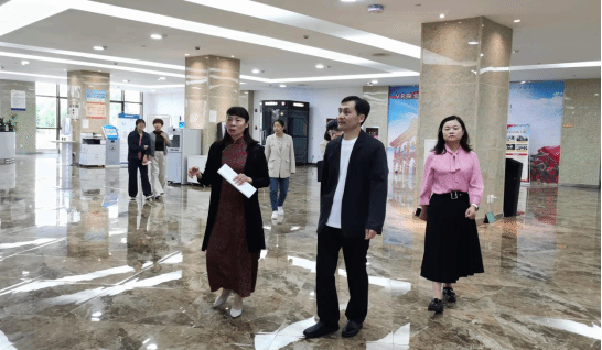 在图书馆领导班子的陪同下,王小波实地察看了图书馆多个功能区。从一楼自助服务区、自修区、数字文化长廊到二楼的书库、诗教成果陈列室、红色文化馆,深入了解图书馆的空间利用、资源建设、服务流程等情况。
