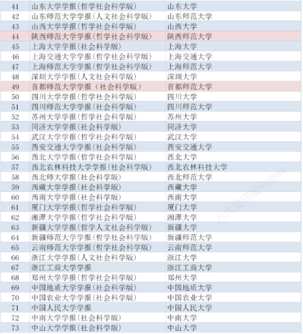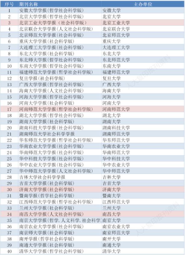 新增:北京工业大学学报(社会科学版)、河南师范大学学报(社会科学版) 济南大学学报(社会科学版)、 南昌大学学报(人文社会科学版)、陕西师范大学学报(哲学社会科学版)、首都师范大学学报(社会科学版)