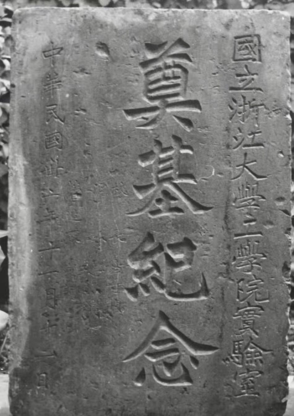 大约是1984年的下半年,时任遵义公园(现遵义纪念公园)办公室主任的花鸟画家蔡聪森,在动物园猴池旁靠遵义四中围墙花坛的堡坎处,不经意地发现一块方方正正的石头,斑斑驳驳的石面上,隐隐约约可以看到一些字迹。他凭着艺术家的直觉感到,这块石头应该有来历、有故事。冲洗擦亮后,赫然映入眼帘的石面右边抬头一行小字是:“国立浙江大学工学院实验室”,中间正文是“奠基纪念”四个大字,落款则依次是“校长竺可桢,院长李熙谋、王国松(代),营造厂寅记”,最后一行是立碑时间“中华民国卅二年十一月十一日”。