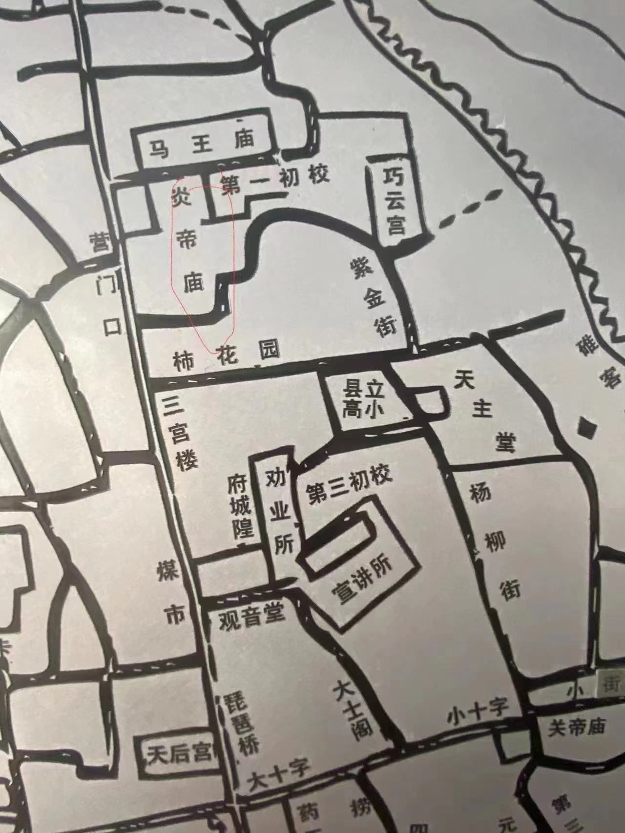 八十多年过去,火神庙早已灰飞烟灭。笔者从《遵义市地名志》里查到:“火神庙,原名炎帝庙,建于明代。遗址现已建为遵义四中校舍”。一张民国四年的遵义城图,直接标注了位于柿花园巷附近的火神庙(炎帝庙)的位置。笔者又通过电话向世居老城的杨敏志老人打听,得到了“火神庙就在遵义四中后门附近”的回答。笔者半信半疑地来到子尹路,透过四中后门所在的那家眼镜店玻璃门往校园里望,一棵由直径约两米的花台围起的大树更是让人顿开茅塞,单凭直觉也就能确定火神庙的大致方位。