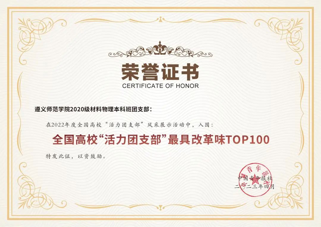 买球2020级材料物理本科班团支部在2022年度全国高校“活力团支部”风采展示活动中,经过事迹撰写、网络投票、专家评审等环节,成功入围全国高校“活力团支部”最具改革味TOP100。(图文/校团委)