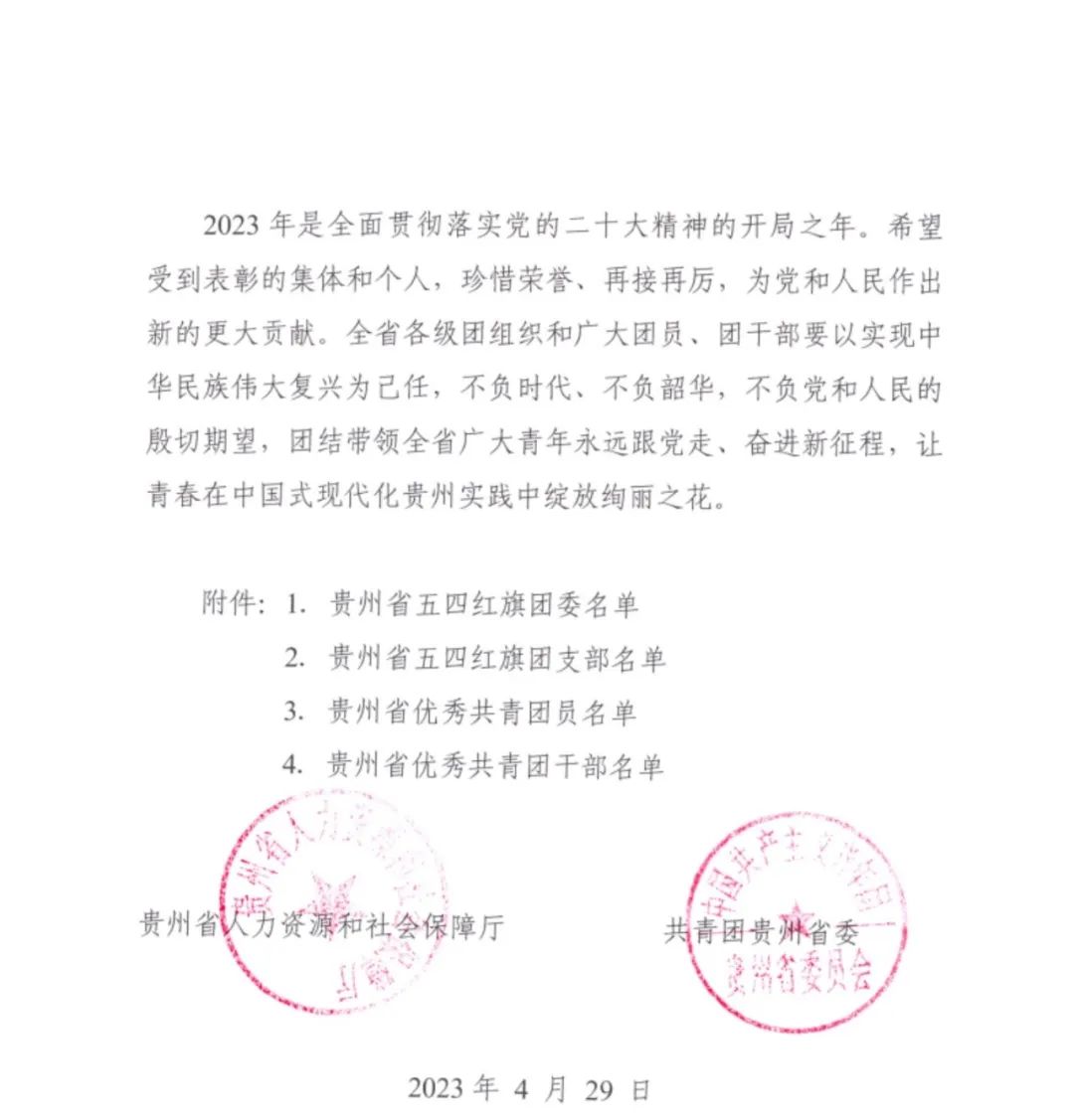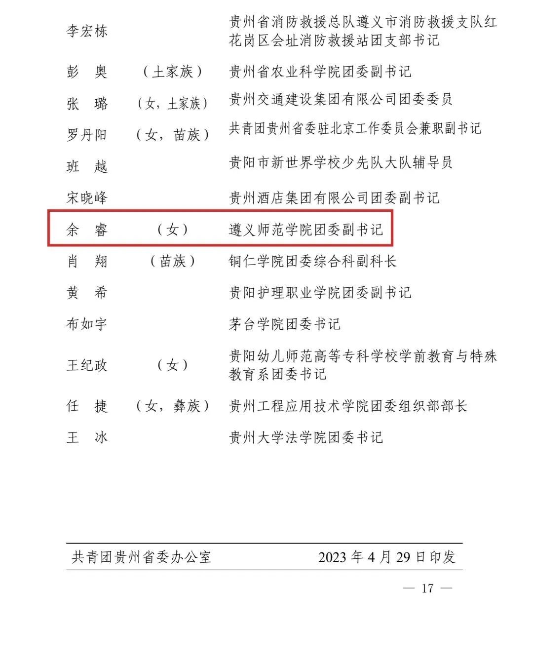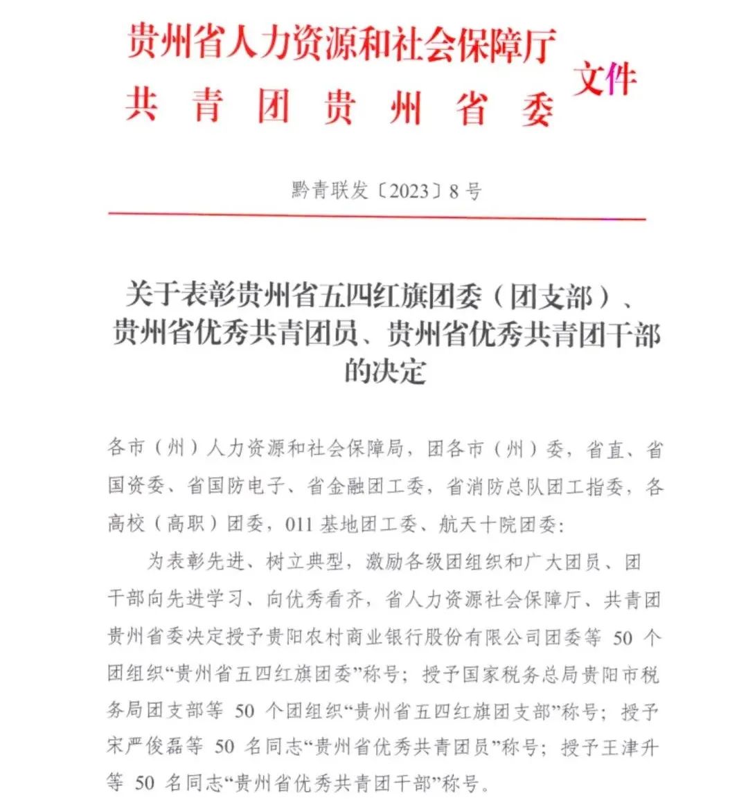五四青年节前夕,贵州省人力资源和社会保障厅、共青团贵州省委印发了《关于表彰贵州省五四红旗团委(团支部)、贵州省优秀共青团员、贵州省优秀共青团干部的决定》(黔青联发〔2023〕8号),全省共有50名团员、50名团干部和100个基层团委(团支部)获得表彰。买球团委副书记余睿荣获“贵州省优秀共青团干部”荣誉称号。