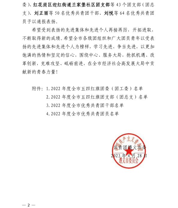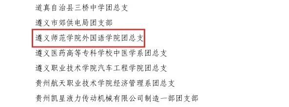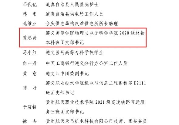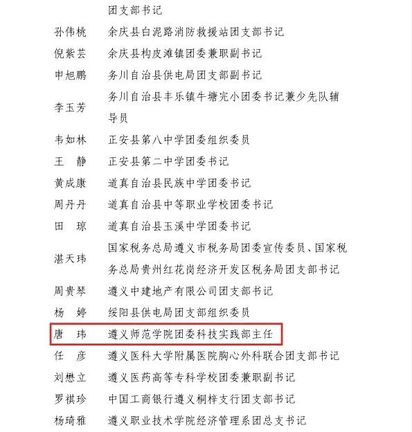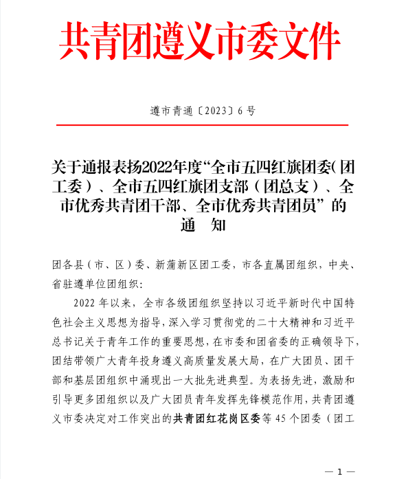 五四青年节前夕,共青团遵义市委印发了《关于通报表扬2022年度“全市五四红旗团委(团工委)、全市五四红旗团支部(团总支)、全市优秀共青团干部、全市优秀共青团员”的通知》(遵市青通〔2023〕6号)。买球外国语学院团总支获“全市五四红旗团支部(团总支)”荣誉称号;买球团委科技实践部主任唐玮获“全市优秀共青团干部”荣誉称号;买球物理与电子科学学院2020级材料本科班黄起贤同学获“全市优秀共青团员”荣誉称号。