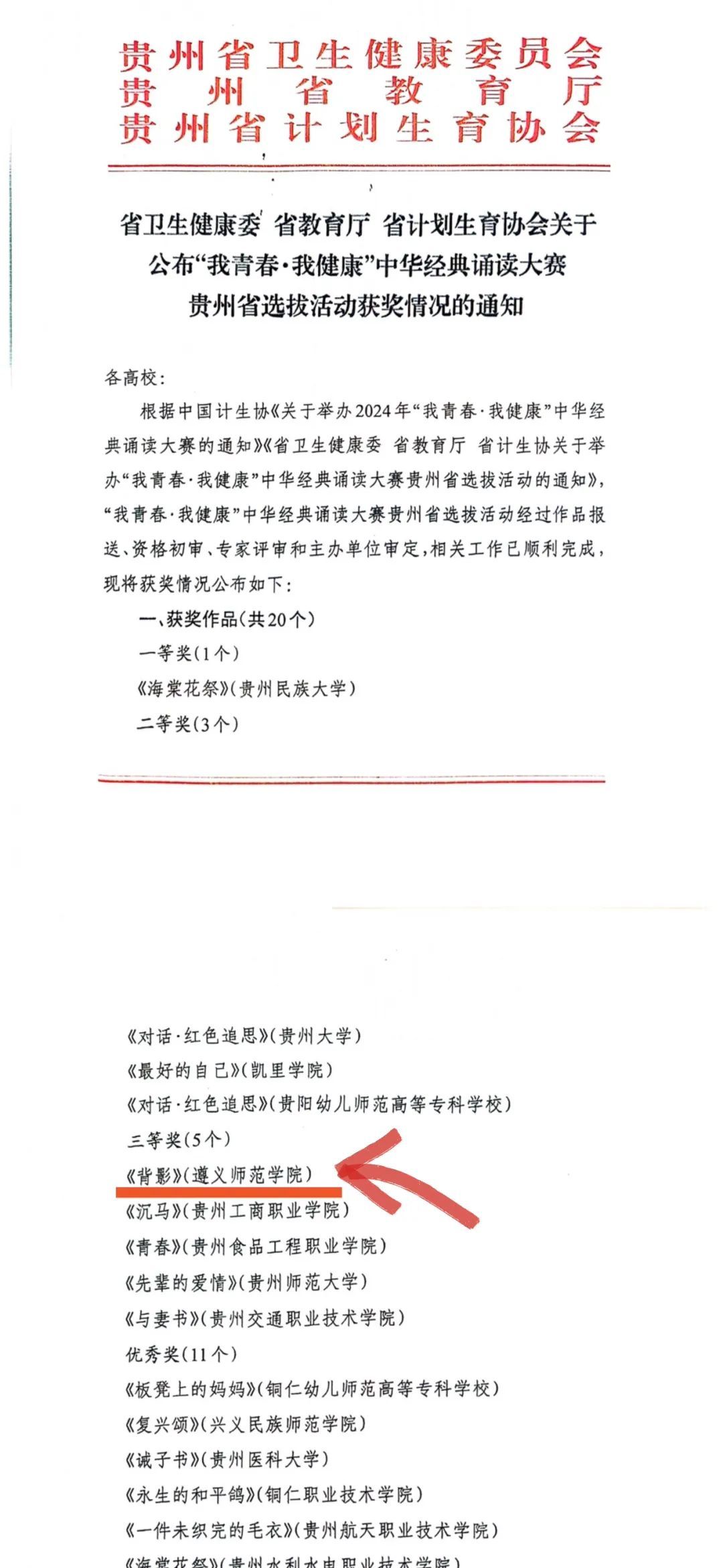 为鼓励青少年诵读中华经典和红色经典中有关“爱情、友情、亲情”的相关内容,引导青少年正确理解友谊、爱情、婚姻对人生的意义,省卫生健康委、省教育厅、省计划生育协会举办了“我青春·我健康”中华经典诵读大赛。在校团委的组织下,由田伟力老师指导,人文与传媒学院朱兆麟、王钦宇、刘林三位同学演绎的朗诵作品《背影》在比赛中获得省级三等奖,微信买球官方网站获得“优秀组织单位”。(文/校团委 图/校团委)