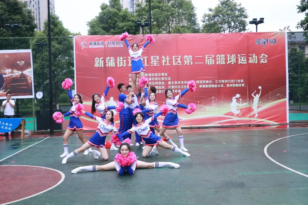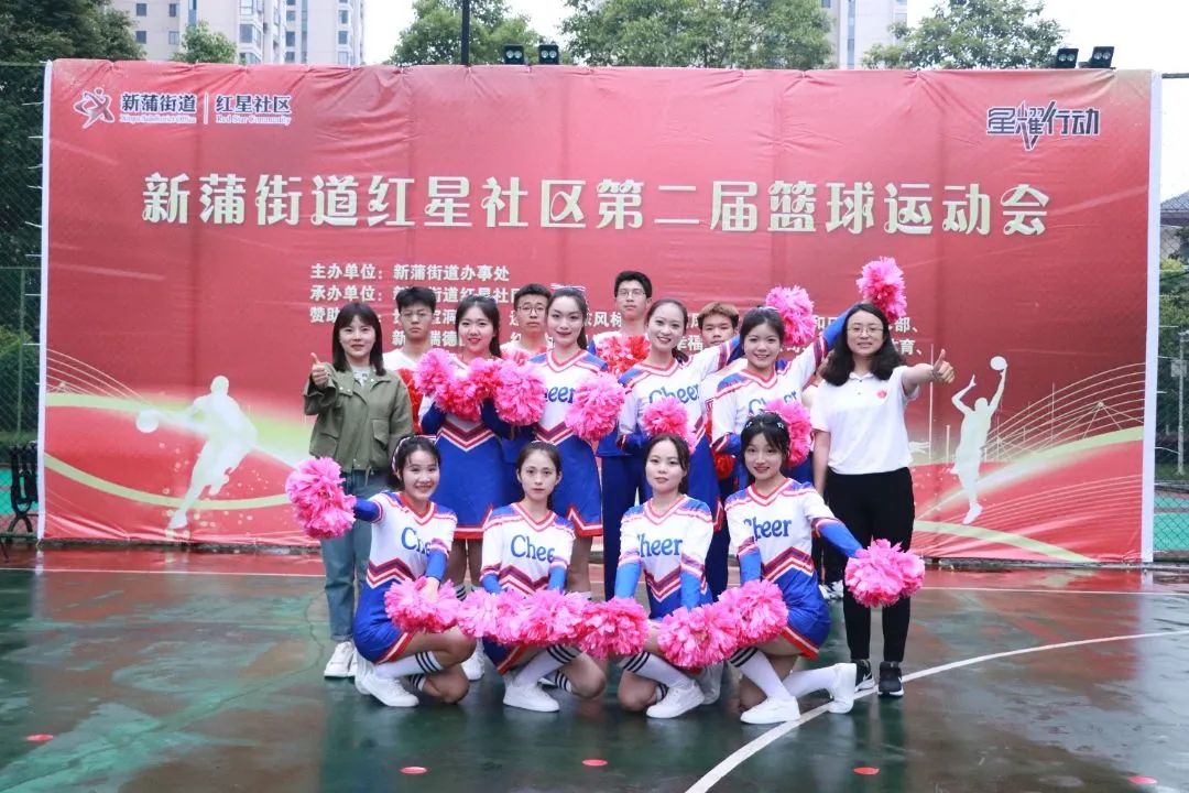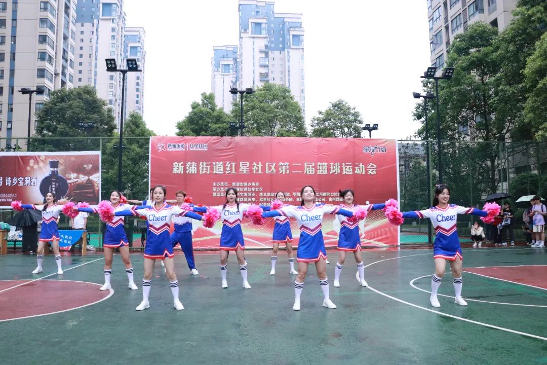 2023年5月15日下午,在新蒲街道红星社区的篮球场上,买球同学身着青春动感的服装,跳着轻盈有劲的舞步,用热情洋溢的啦啦操为红星社区第二届篮球运动会加油助威。同学们身姿律动、动作优美,如跳跃的火焰点燃了赛场,不但给现场观众以完美的视觉享受,还把现场的气氛推向高潮。