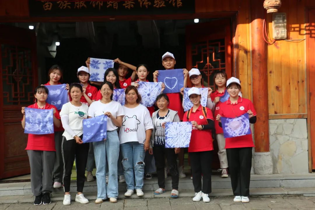 在这里,我们得到了当地村民的友好礼待和帮助,也为他们宣讲了红色英雄人物的事迹,将红色精神在此发扬传播;在这里,我们跟当地居民相处融洽,感受到了苗族阿哥、阿妹的多才多艺和热情昂扬;在这里,我们学习了蜡染和扎染的传统手工工艺,同学们都纷纷拿起蜡刀在棉麻布上描摹独一无二的蜡染图案,亦或用线扎起白布再放进草药调制的染缸里,最后制成一副扎染图;在这里,我们欣赏了苗绣传承人们堪称美轮美奂的刺绣过程,以及一个个精美的苗绣成品;在这里,随处可见“苗汉一家,共创辉煌”的标语,让我们切身处在苗汉一家亲,民族大团结的氛围之中,感受到了苗汉情深。
