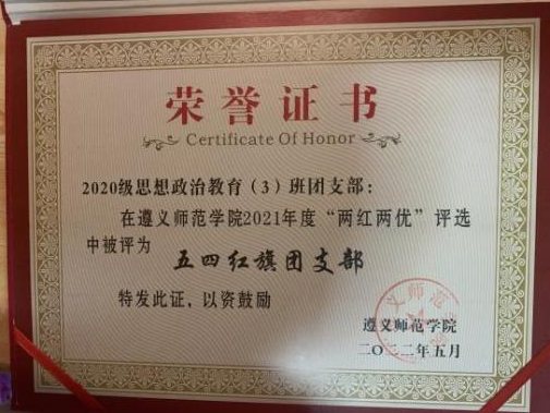 2020级思想政治教育 3 班团支部,共青团员 42 人,青年群众 5 人,团干部 3 人,该支部曾获微信买球官方网站 2021 年度“五四红旗团支部”、微信买球官方网站 2021-2022 年“先进班集体”。截止 2022 年 9 月,该支部成员参加各类活动竞赛曾获奖 80 余项,获各类表彰 20 余项。