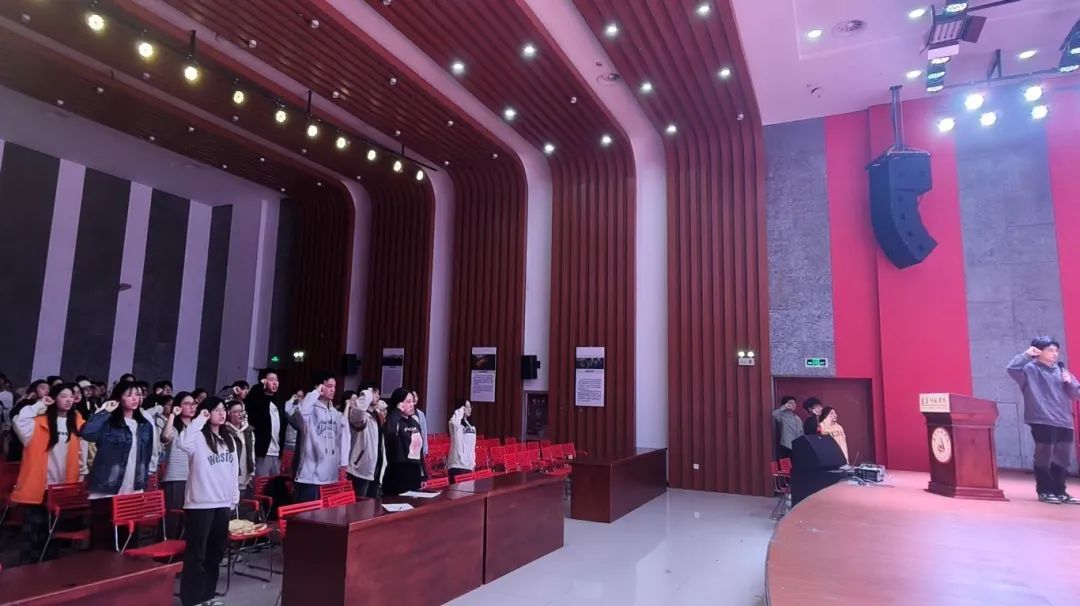 新闻中心记者杨珺森在会上宣读新记者名单。总编辑罗星详细介绍了青年媒体中心的组织架构、规章制度、视觉识别系统等内容。副总编辑郑全杰带领全体记者宣誓。
