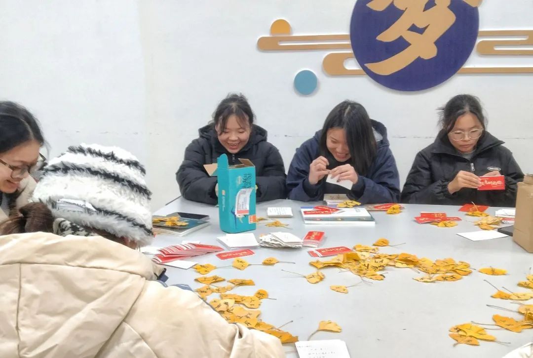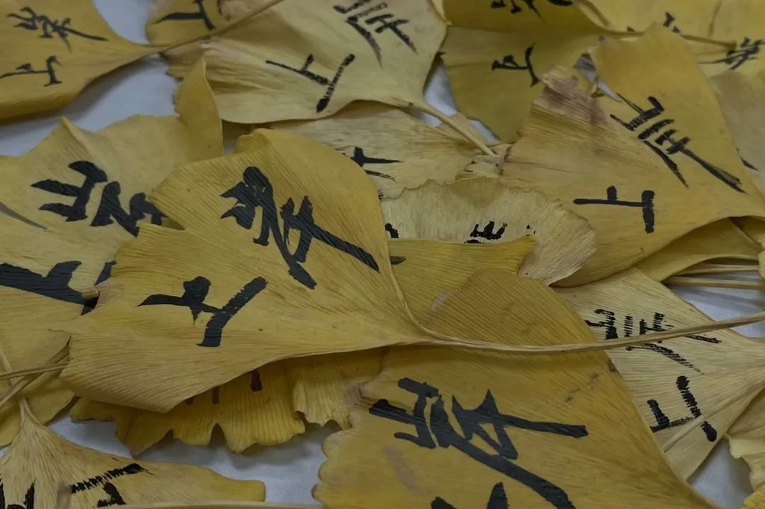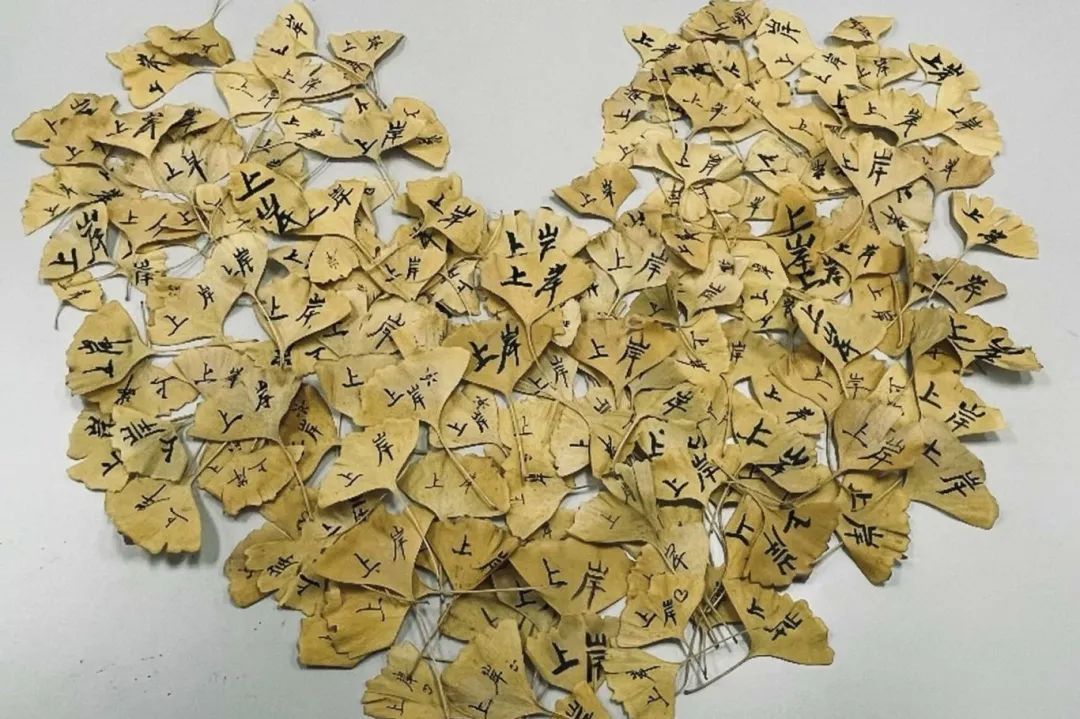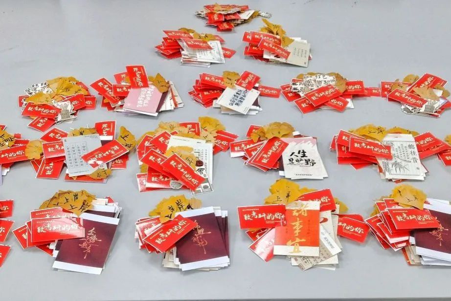 美术学院的热心同学们,在颜色明亮的银杏叶上用毛笔写下一句句祝愿,再把银杏叶夹着祝福和善意塞到信封里,送给各位考研学子。蟾宫折桂、旗开得胜、名列前茅……但最重要的是“顺利上岸”!