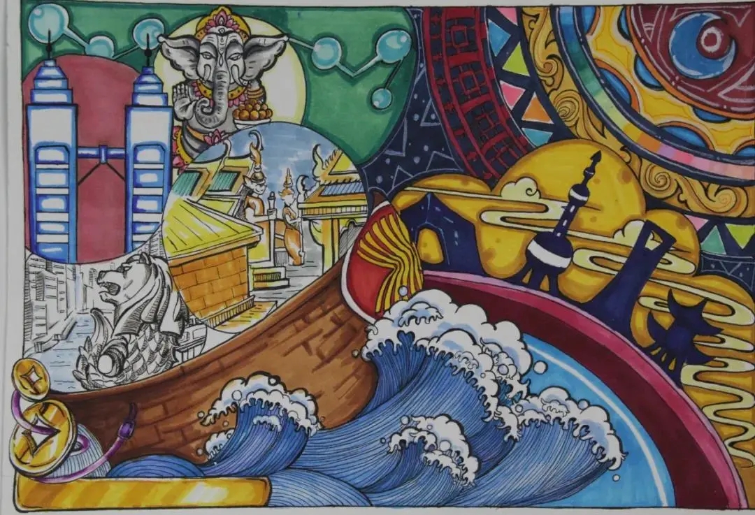 买球选送的作品内容都紧扣我国与东盟国家同舟共济、共克时艰,携手抗击新冠肺炎疫情这一主题,一幅幅绘画作品别出心裁、夺人眼球,充分表达了中国与东盟青年的深厚情谊。同学们以画纸为纽带,画出我国与东盟国家的美丽蓝图;以画笔为依托,勾勒出我国与东盟国家的壮阔未来;以画作为信物,促进了中国与东盟青年文化艺术的交流与合作。下面,小编带大家一起欣赏优秀画作吧!