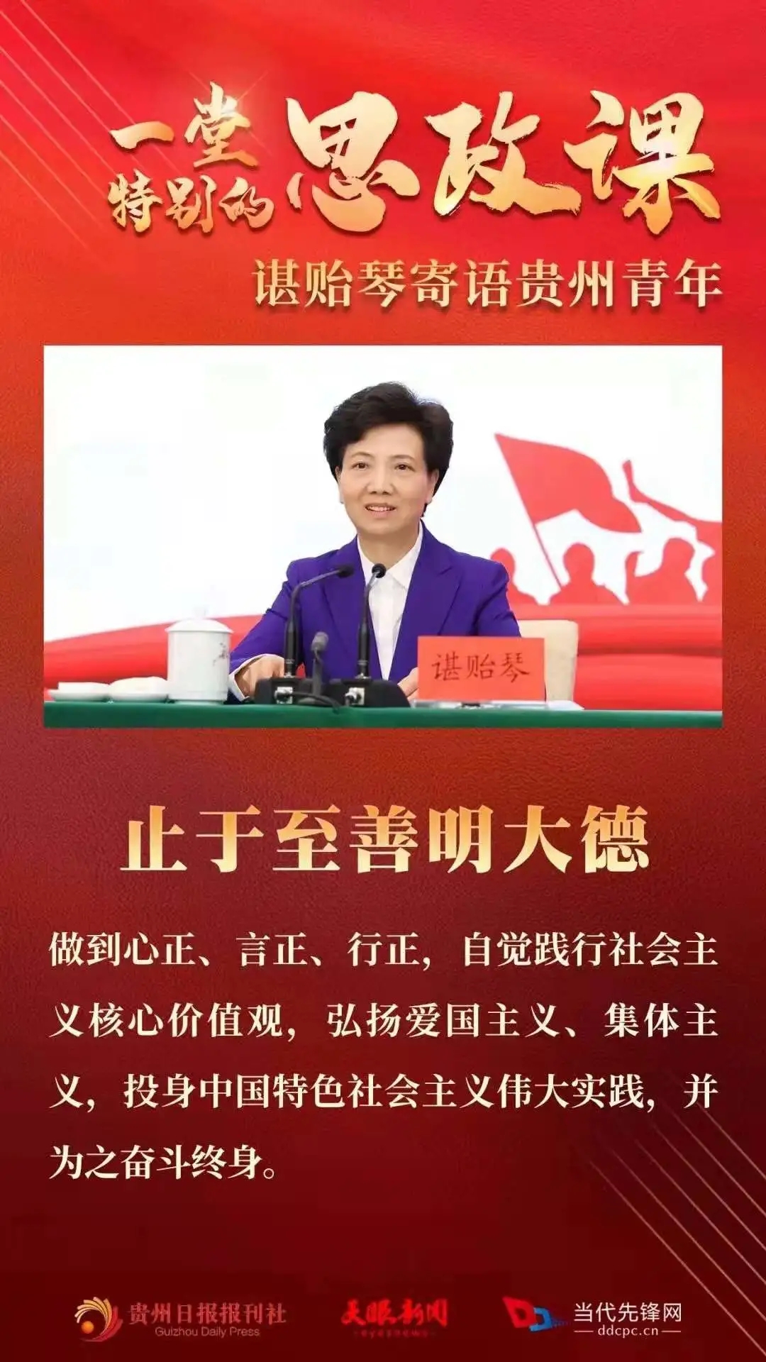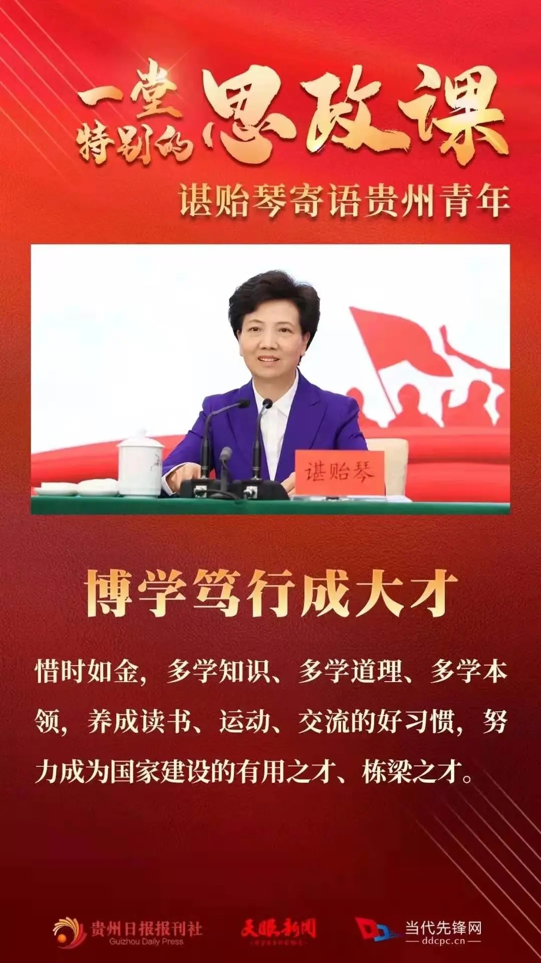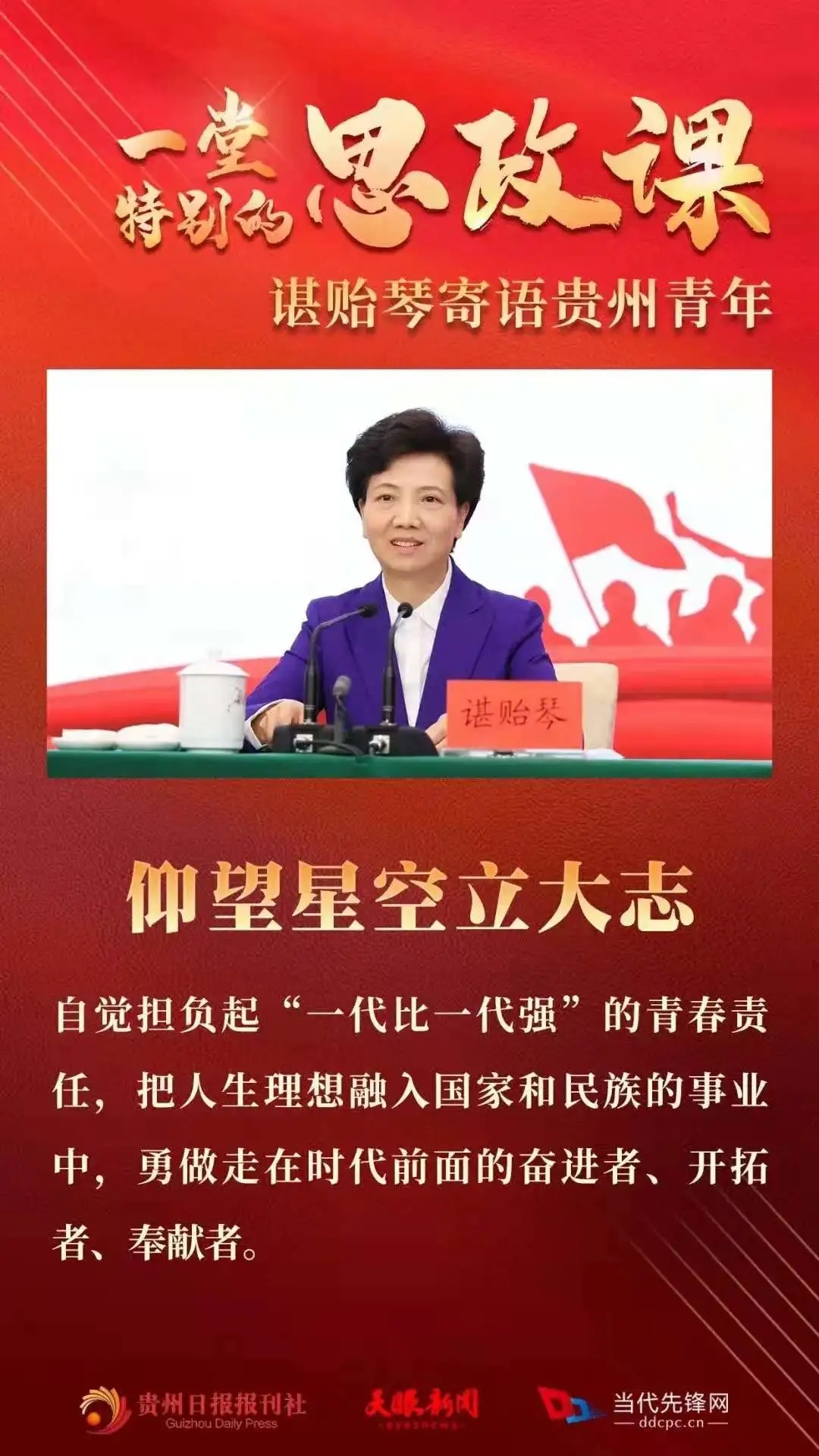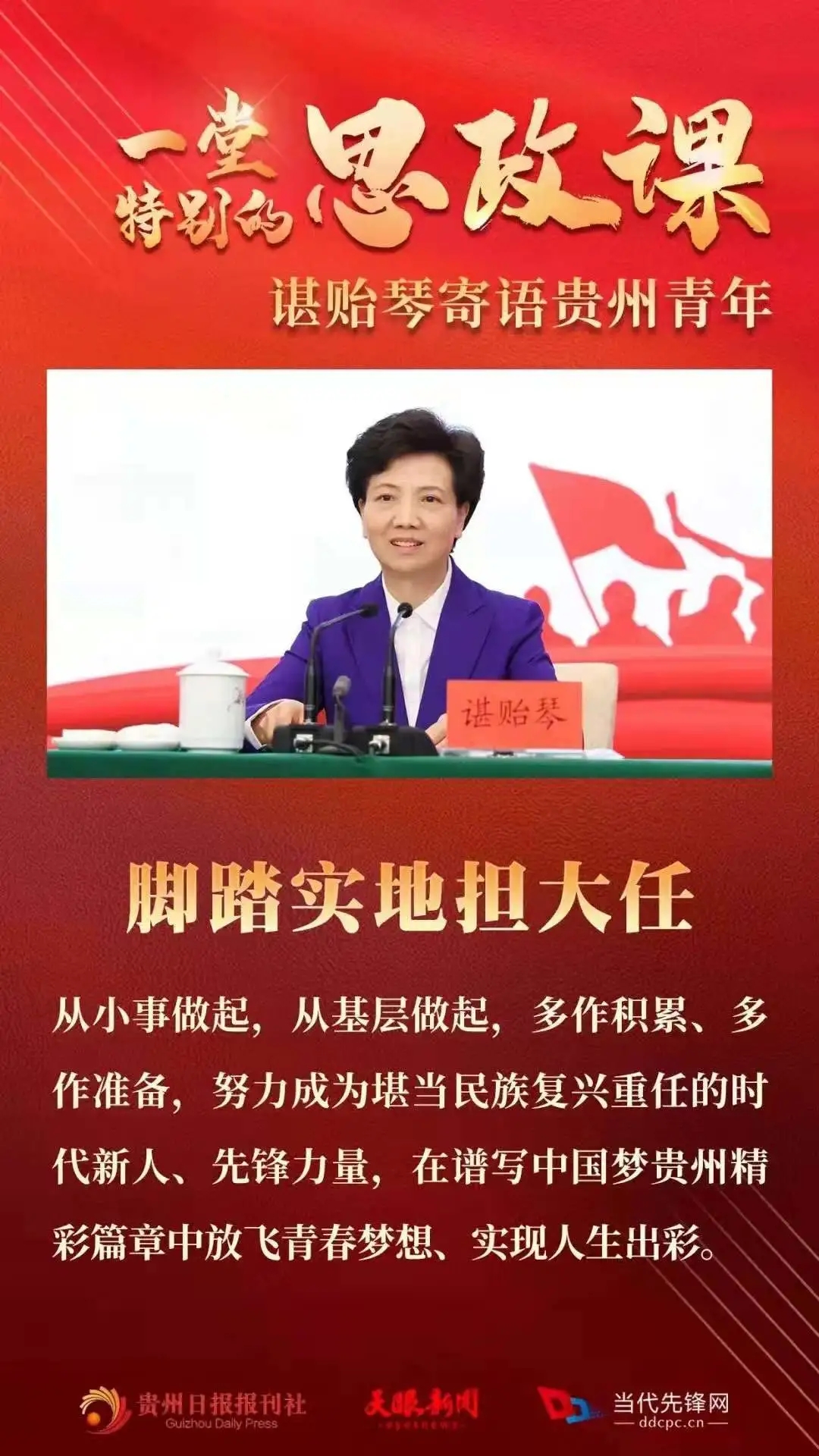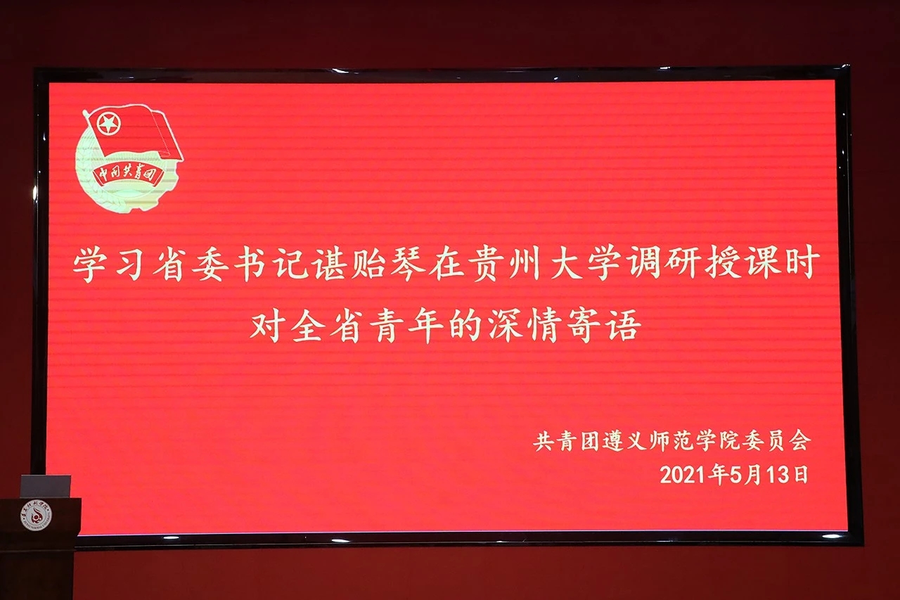 5月8日,在习近平总书记视察贵州大学10周年之际,省委书记、省人大常委会主任谌贻琴到贵州大学调研,参加贵州共青团主题团日示范活动,并为高校师生讲授思想政治理论课,与青年学子一起回顾我们党、我们国家的辉煌历程、一起重温习近平总书记对贵州的关心关怀。她寄语全省广大青年,要牢记习近平总书记的殷切嘱托,仰望星空立大志,止于至善明大德,博学笃行成大才,脚踏实地担大任,为中华民族伟大复兴奉献青春力量,在开创多彩贵州新未来中实现人生出彩。