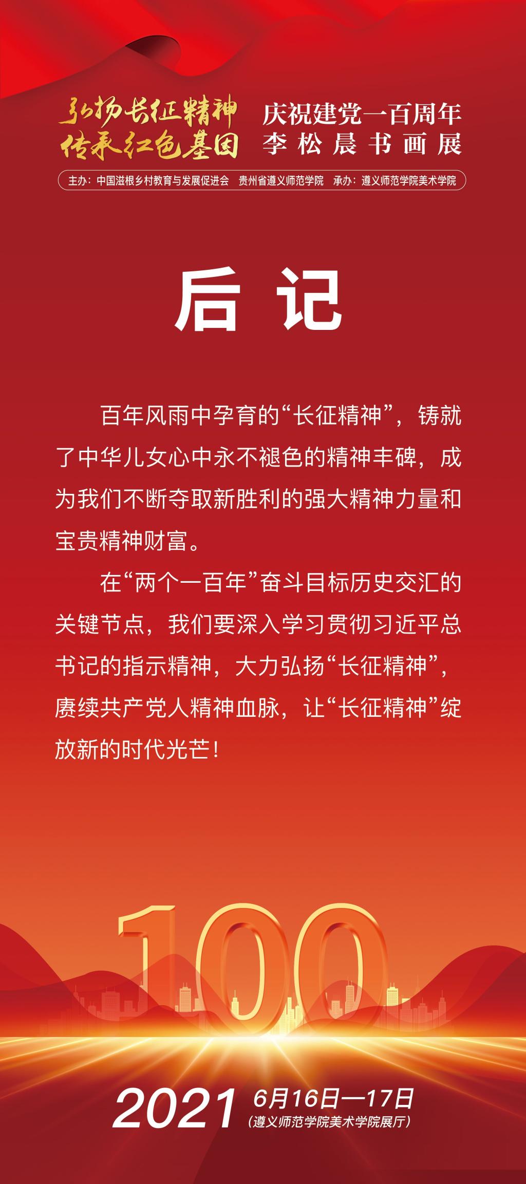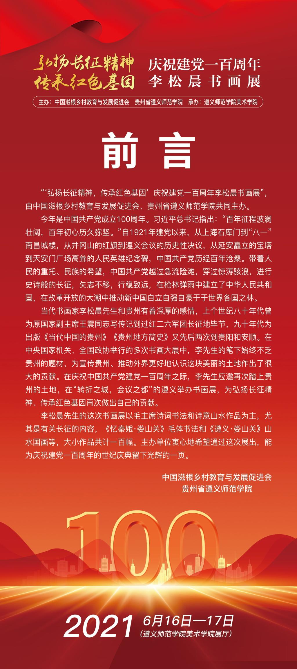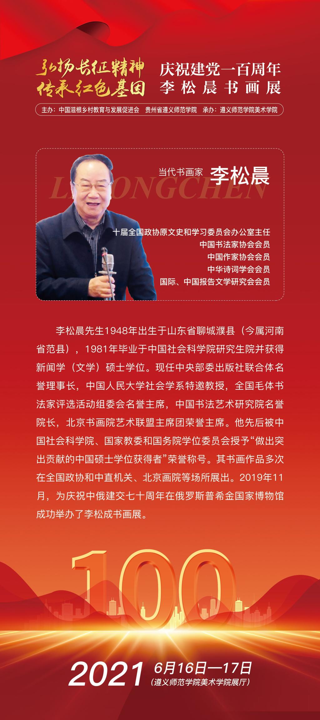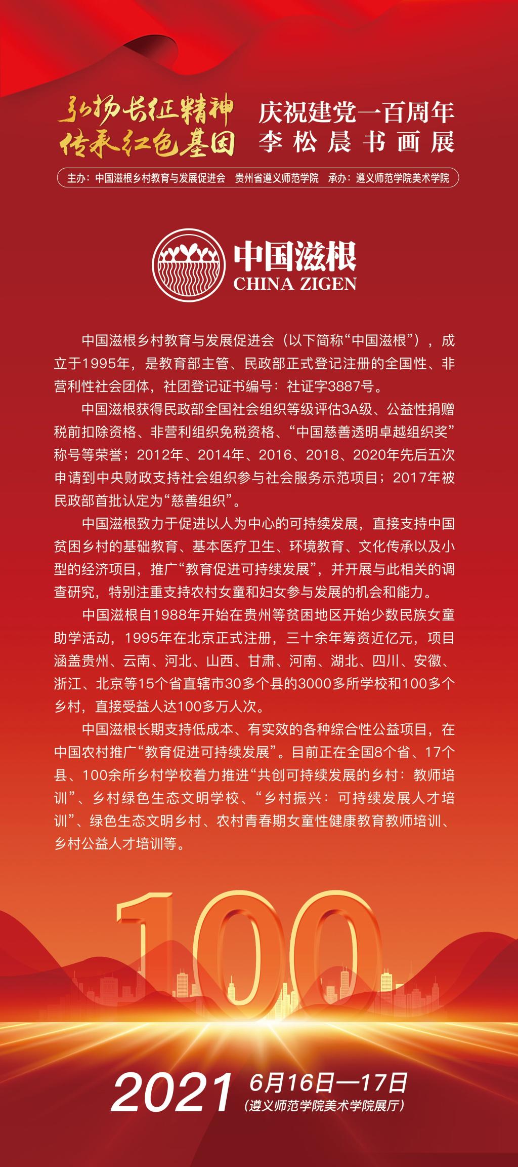 由中国滋根乡村教育与发展促进会、贵州省微信买球官方网站主办的“‘弘扬长征精神,传承红色基因’ 庆祝建党一百周年李松晨书画展”,将于6月16日至17日在微信买球官方网站隆重举行。