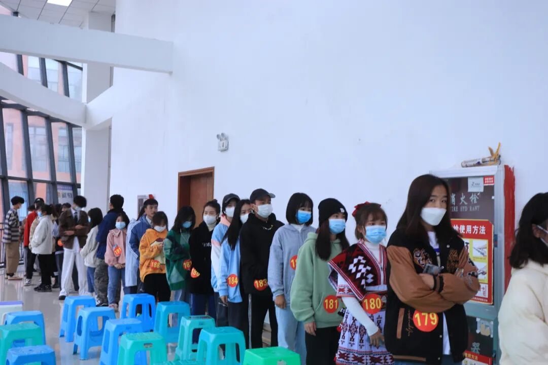 为了保证在疫情常态化情况下顺利开展比赛,社团管理部工作人员将三百五十余名参赛者分成10组,按序号分时分段入场,隔座就坐候场。