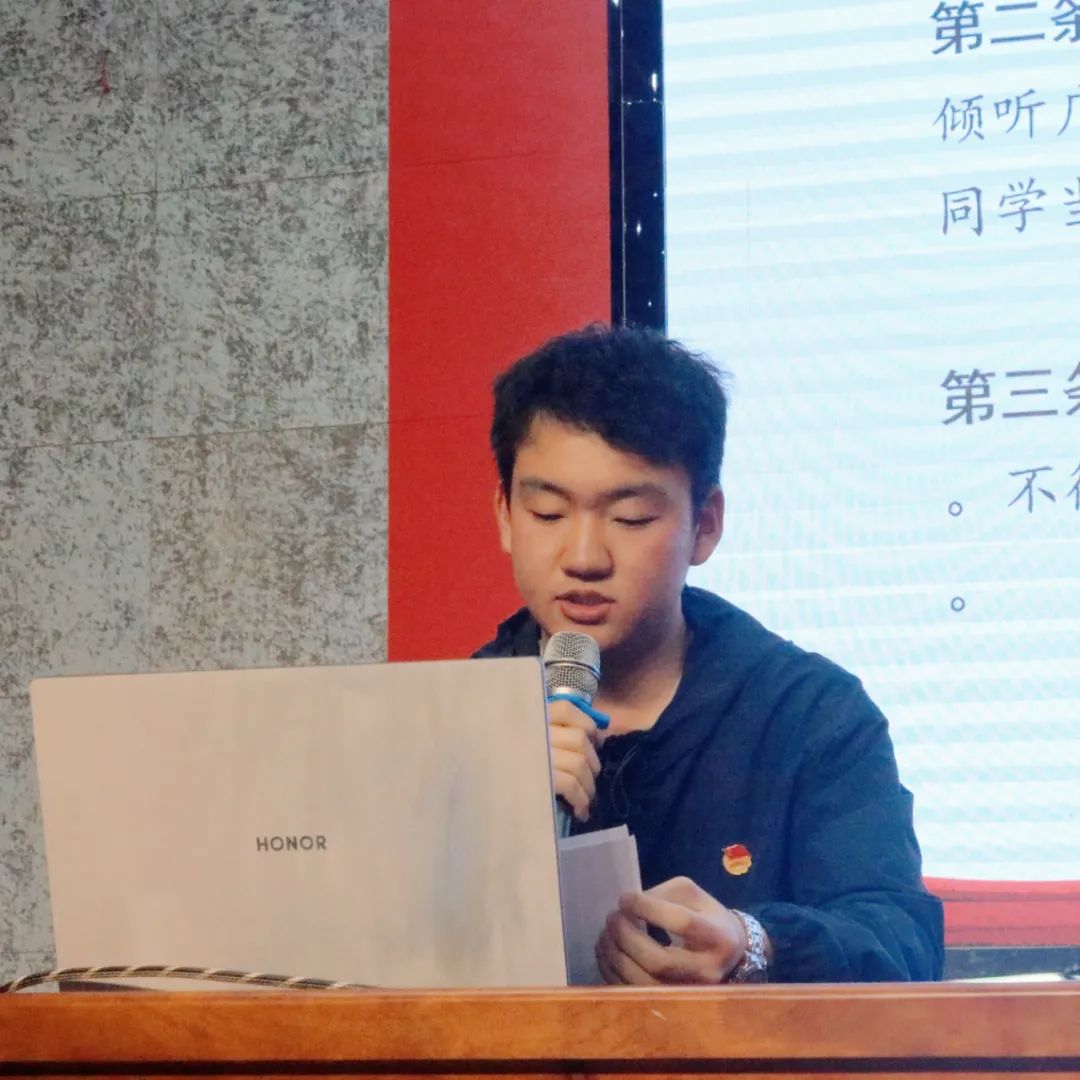 校学生会主席团成员李予慈、邹维栋领学《关于加强和改进新时代学联学生会工作实施方案》、《关于学联学生会工作人员改进作风服务同学的若干规定》,号召学生会工作人员要恪守学生本分、牢记服务宗旨、永葆理想情怀、勤勉务实做事、营造平等氛围、摒弃庸俗习气,做到有职就有责,有责得尽责。