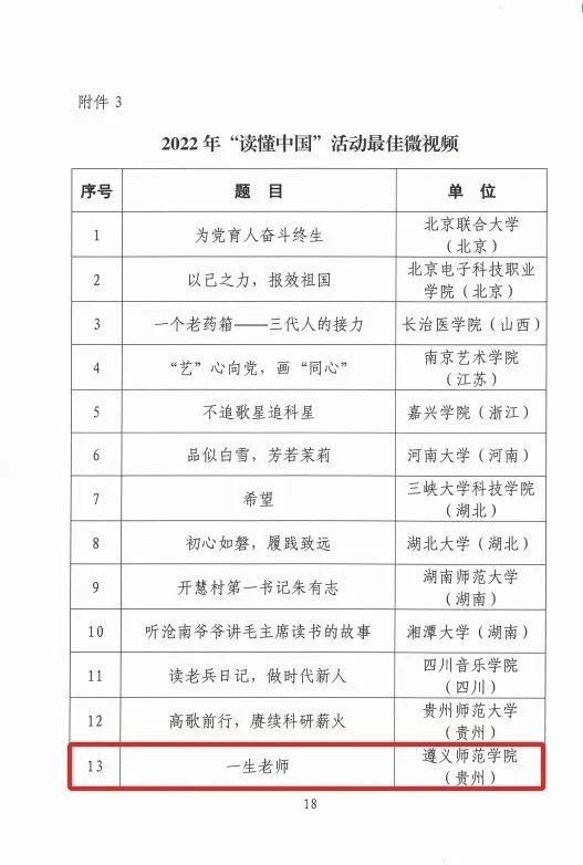 近日,教育部关工委发文《关于公布2022年“读懂中国”活动入选作品名单的通知(教关委函〔2022〕13号)》,买球报送的微视频参赛作品《一生老师》被评为2022年“读懂中国”活动最佳微视频(全国30项,贵州省仅2项),这是买球第一次在教育部关工委“读懂中国”活动评选中喜获佳绩。