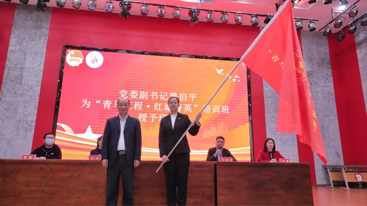 仪式在全体师生高唱《光荣啊!中国共青团》中拉开序幕。曾伯平对新一期青马班和的业余团校学员们表示祝贺,向第八期“青马工程•红城青英”培训班授予班旗,并预祝大家通过此次学习能学有所获,成为优秀的青年马克思主义接班人。