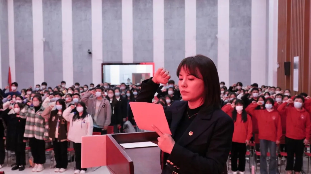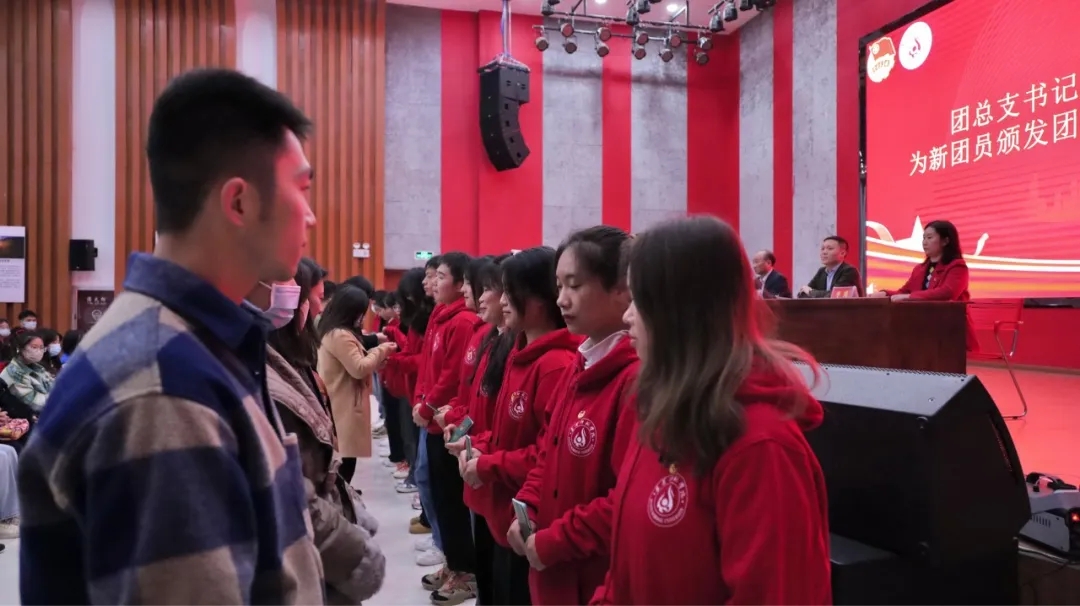 仪式上,余睿带领新、老团员宣读及重温入团誓词,并和李瑾一同为第七期青马班优秀学员颁发荣誉证书。各二级学院团总支书记(副书记)为新团员颁发团员证、佩戴团徽。