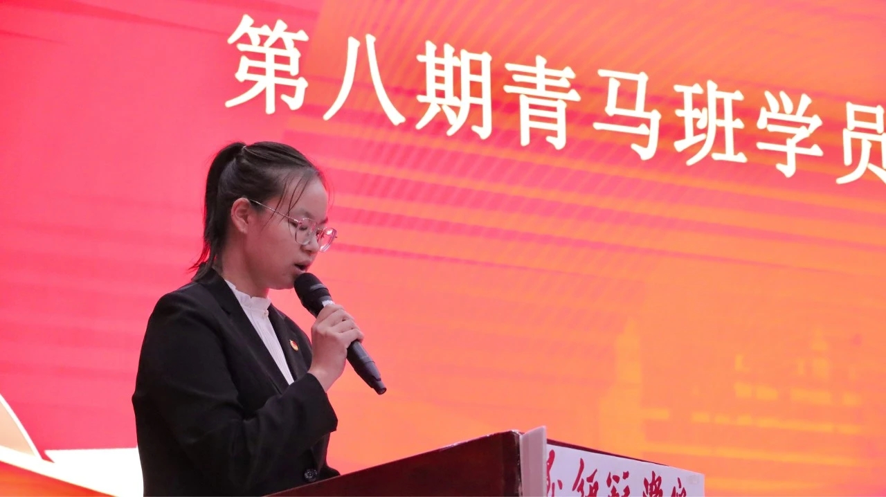 第八期青马班学员代表李思颖发言,她代表所有学员郑重承诺,必将珍惜本次培训机会,遵守青马班和业余团校的规章制度,学深悟透党的二十大精神,努力争做服务为先的奉献者和思想引领的实践者。